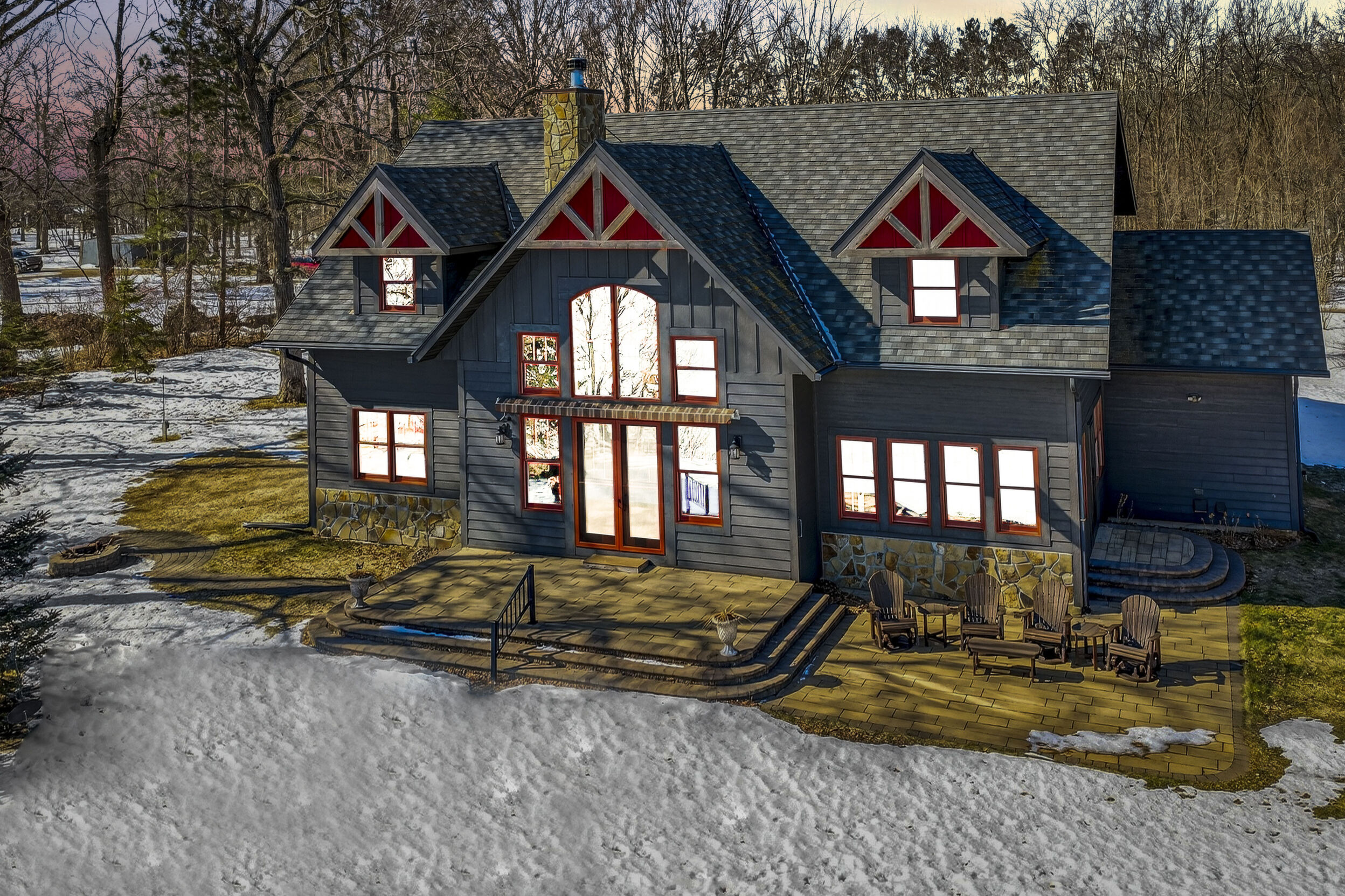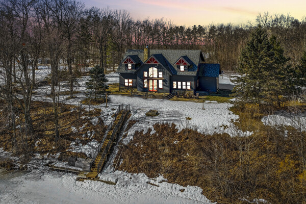 Amazing Chalet on the Red Cedar Lake Chain with 160 feet of pristine frontage! Built in 2016, this stunning 4,400 sq ft home showcases exceptional craftsmanship and high-end finishes throughout. The breathtaking great room features soaring ceilings, a majestic flagstone fireplace, and beautiful hardwood floors. The kitchen is a showpiece with custom rustic hickory cabinetry and Cambria quartz countertops, while a cozy loft captures stunning sunrise views over the lake. Comfort abounds with main level owner's suite and laundry, heated tile floors, in-floor heat, custom tile showers, a heated garage floor, and upgraded steel shingles for long-lasting durability. The lower level offers an incredible entertainment space plus the potential to finish two 13x31 rooms (804 additional sq ft) for a theater, extra sleeping quarters, or a fitness area. Outside, enjoy a large level lakeside yard, beautiful patios, stamped concrete walkways, and a retractable awning designed for effortless entertaining. A 20x40 heated detached garage provides excellent additional storage. The Red Cedar Chain offers 2,400+ acres of recreation, fishing, a boat-up golf course, a restaurant/pub with live music, and easy access to ATV and snowmobile trails.