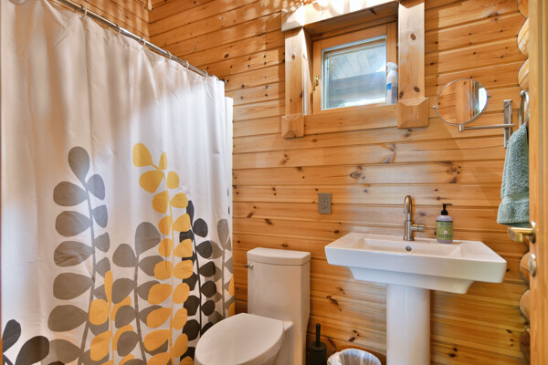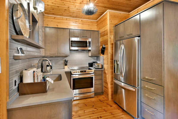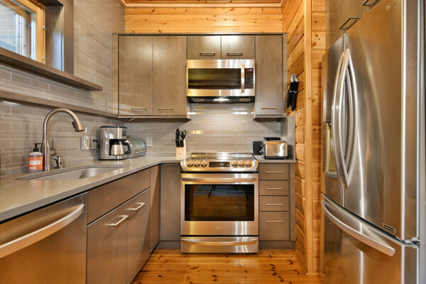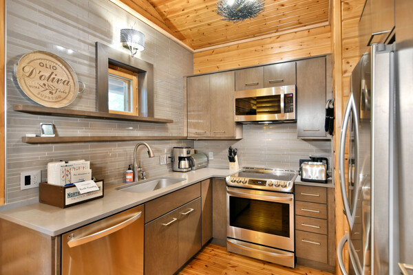 Inside, The Bike Cabin features 2 spacious bedrooms, one has a workstation if you need to work while you're here, both have their own full bathroom ensuite. A cozy living room complete with a fireplace and a fully equipped kitchen.