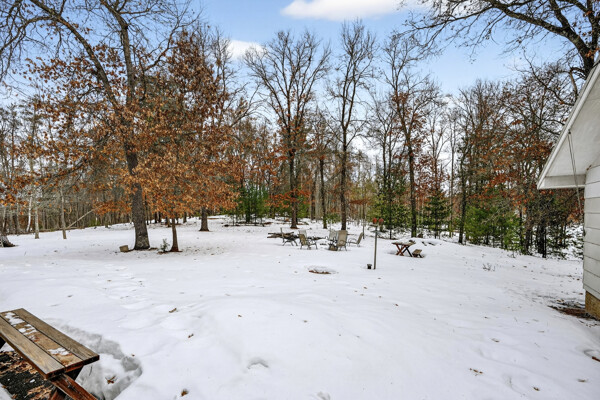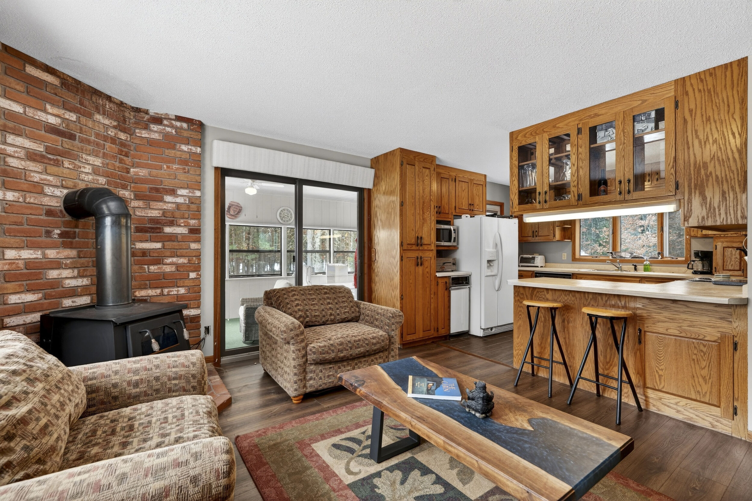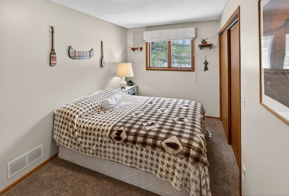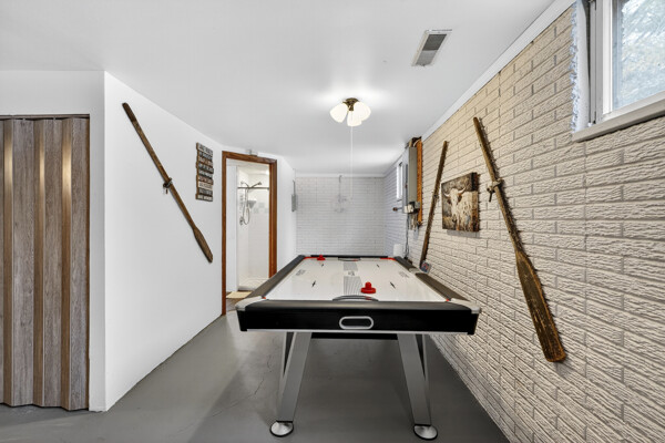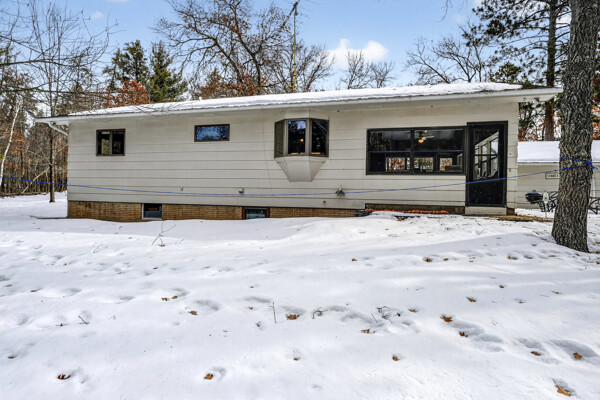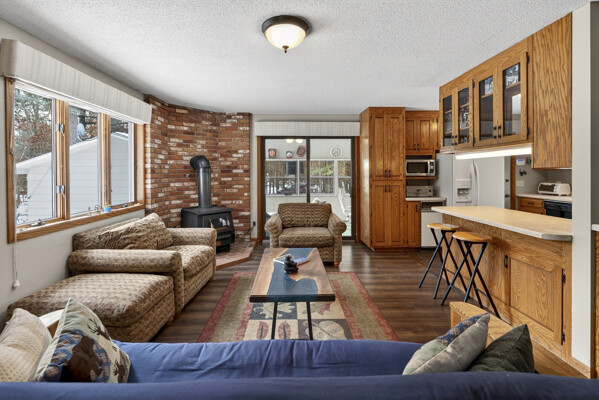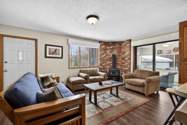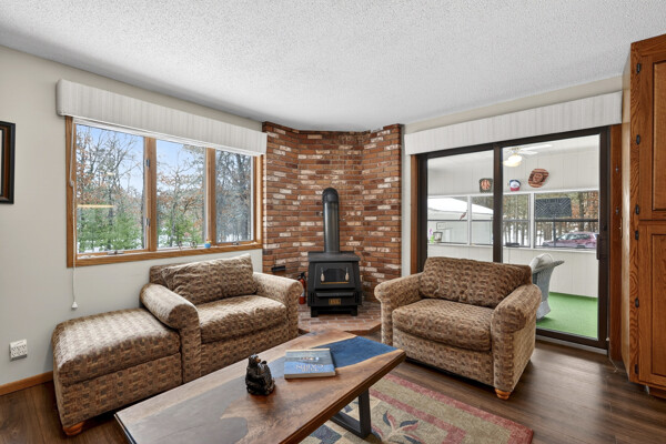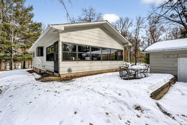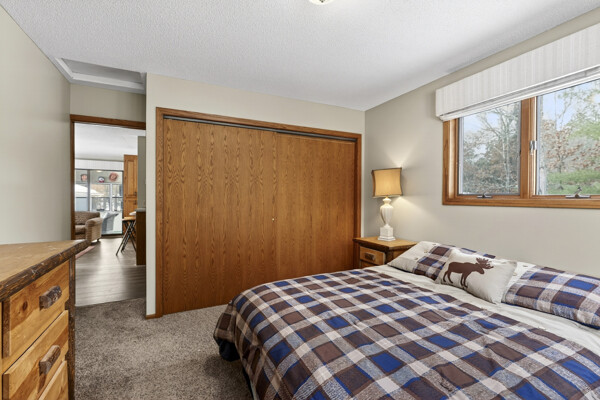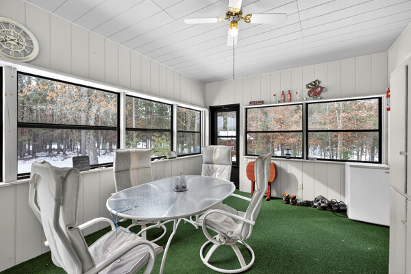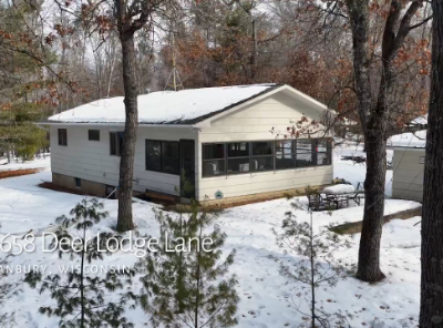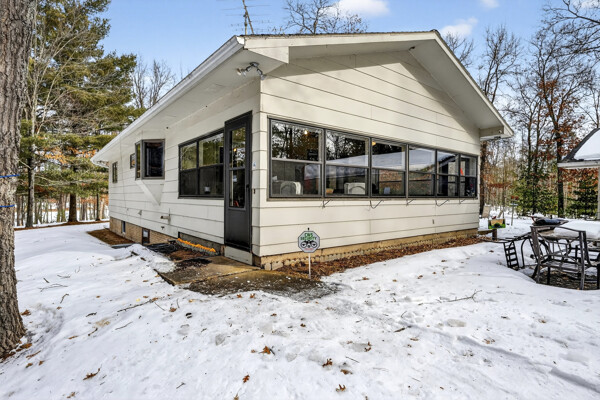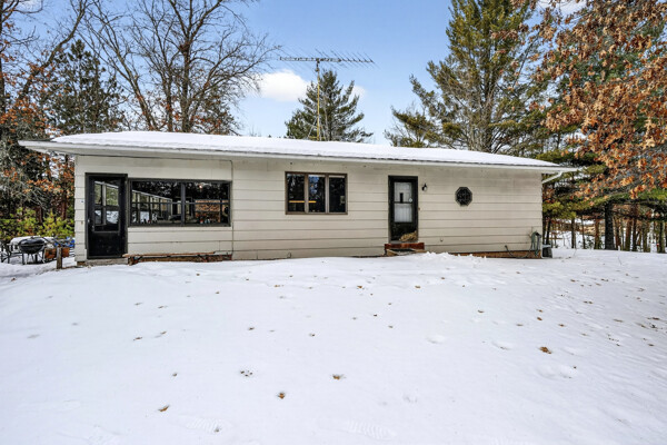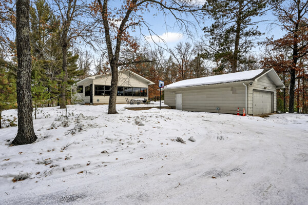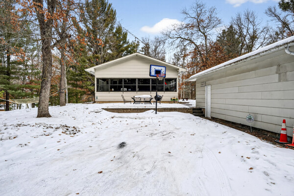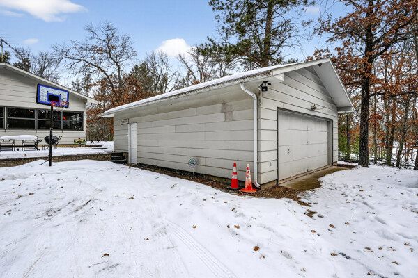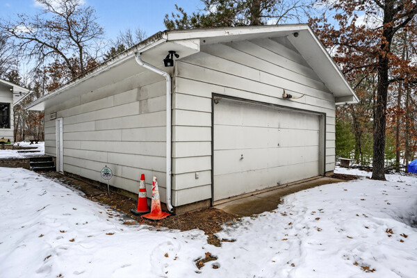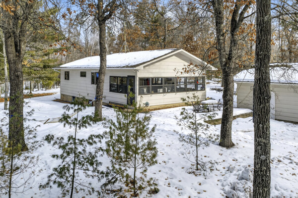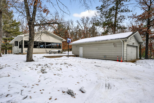 window-to-window seasonal porch—perfect for dining, card games, or lively storytelling sessions. Inside, the open kitchen with a breakfast bar flows into a living area where a cozy wood burner beckons. The main floor boasts two inviting bedrooms and a full bath with laundry options, while the lower level surprises with two family areas, an extra bedroom, and bath for visiting guests. Just a few steps away, the detached garage features dual overhead doors, capable of sheltering boats, UTV/ATV, golf vehicles or storing summer toys. Here, nature and nurture blend seamlessly, offering east Cadotte beach a couple miles away. storing canoe & kayaks on the lakeside racks or drop your boat at the launch. As a Voyager Village member