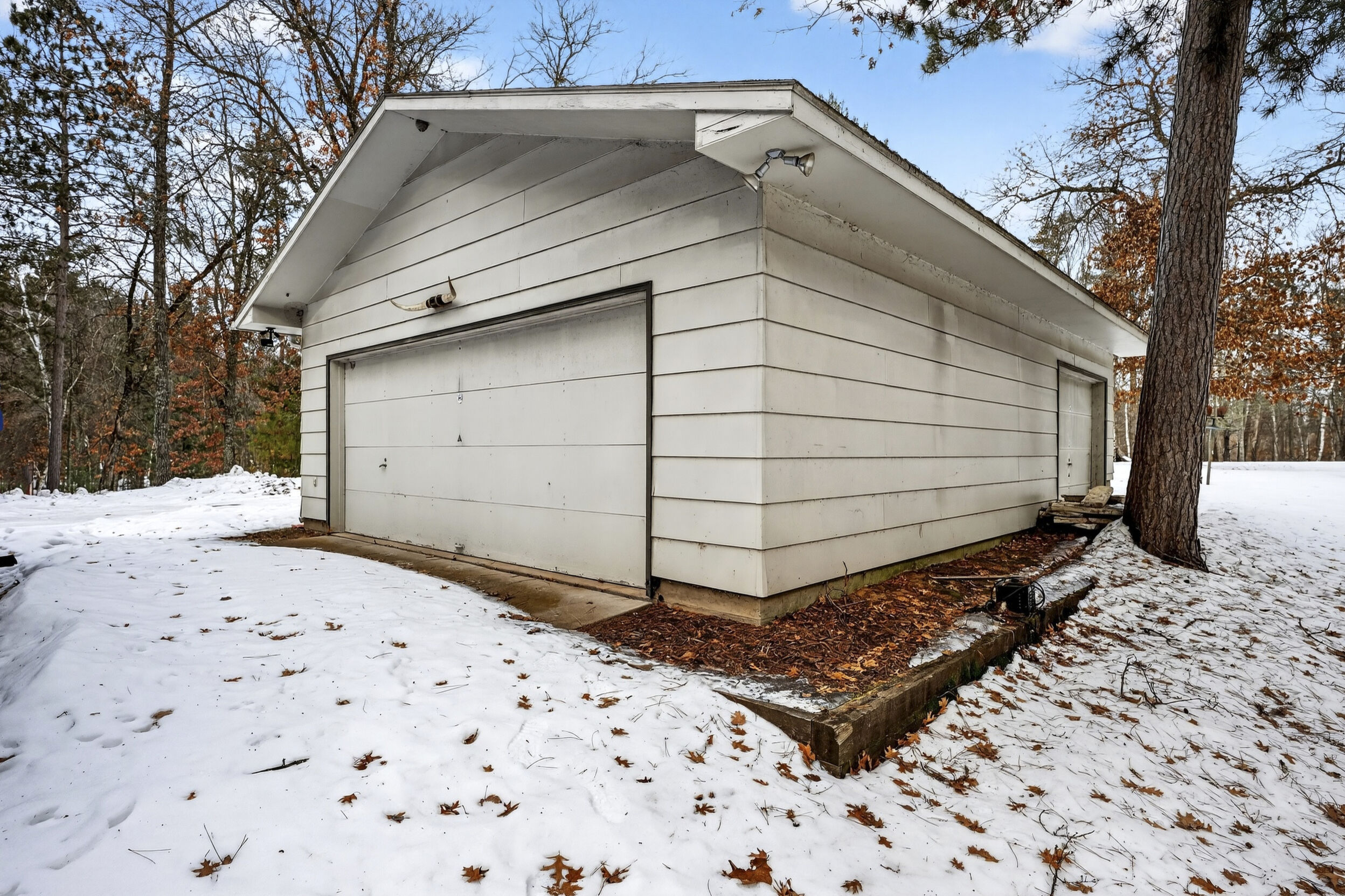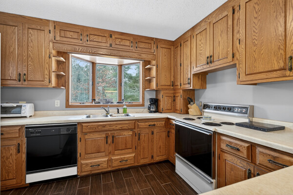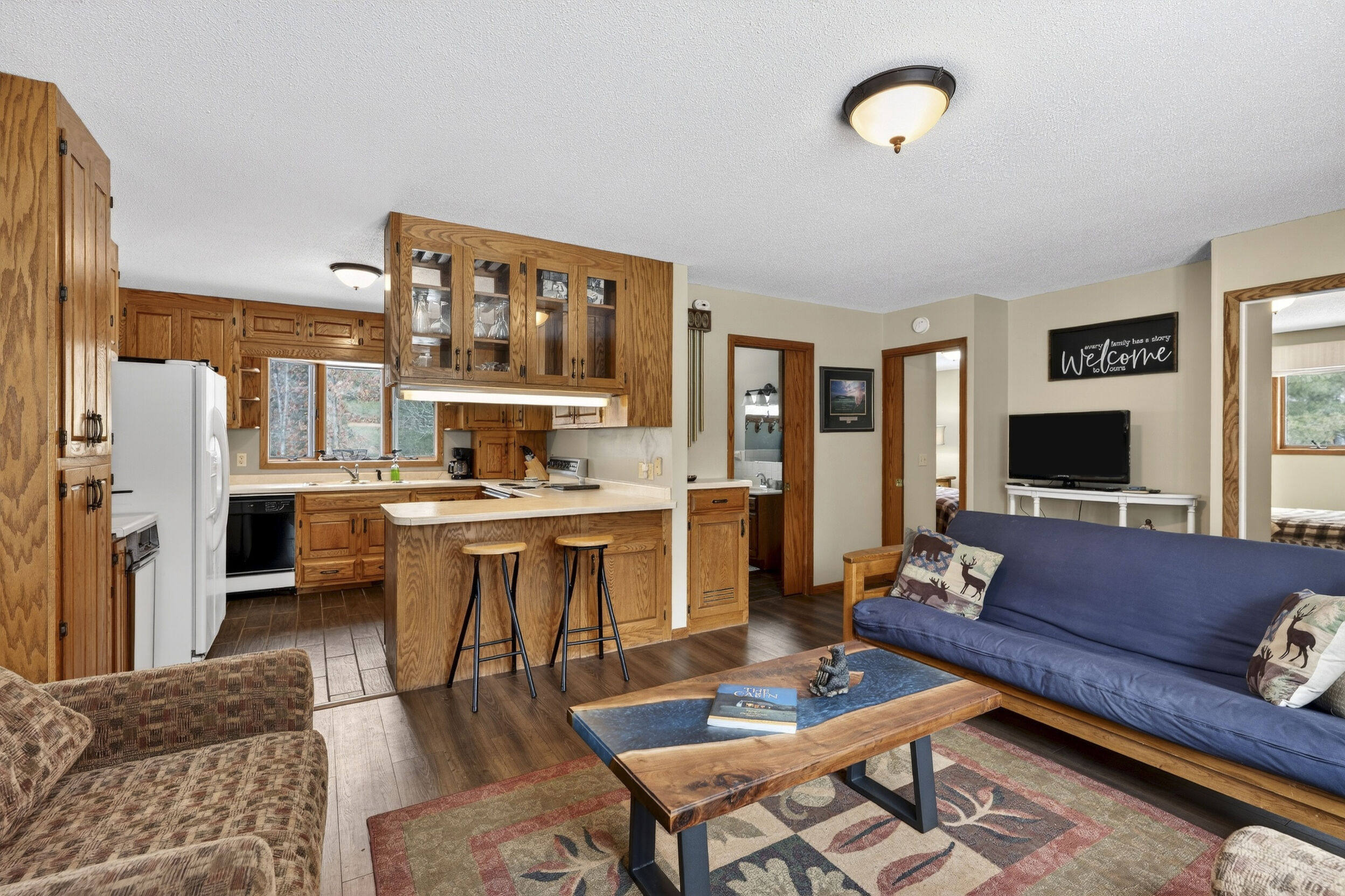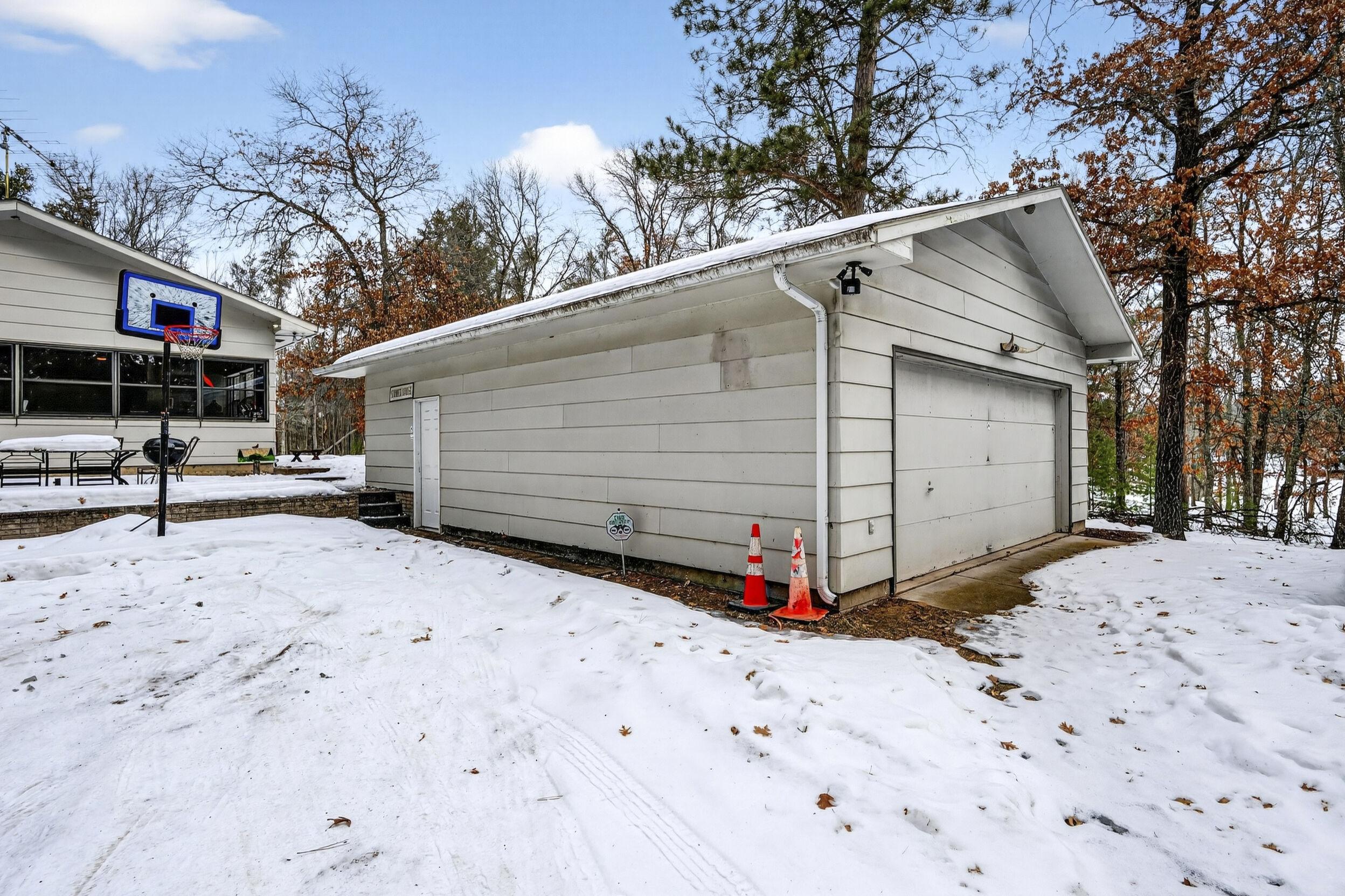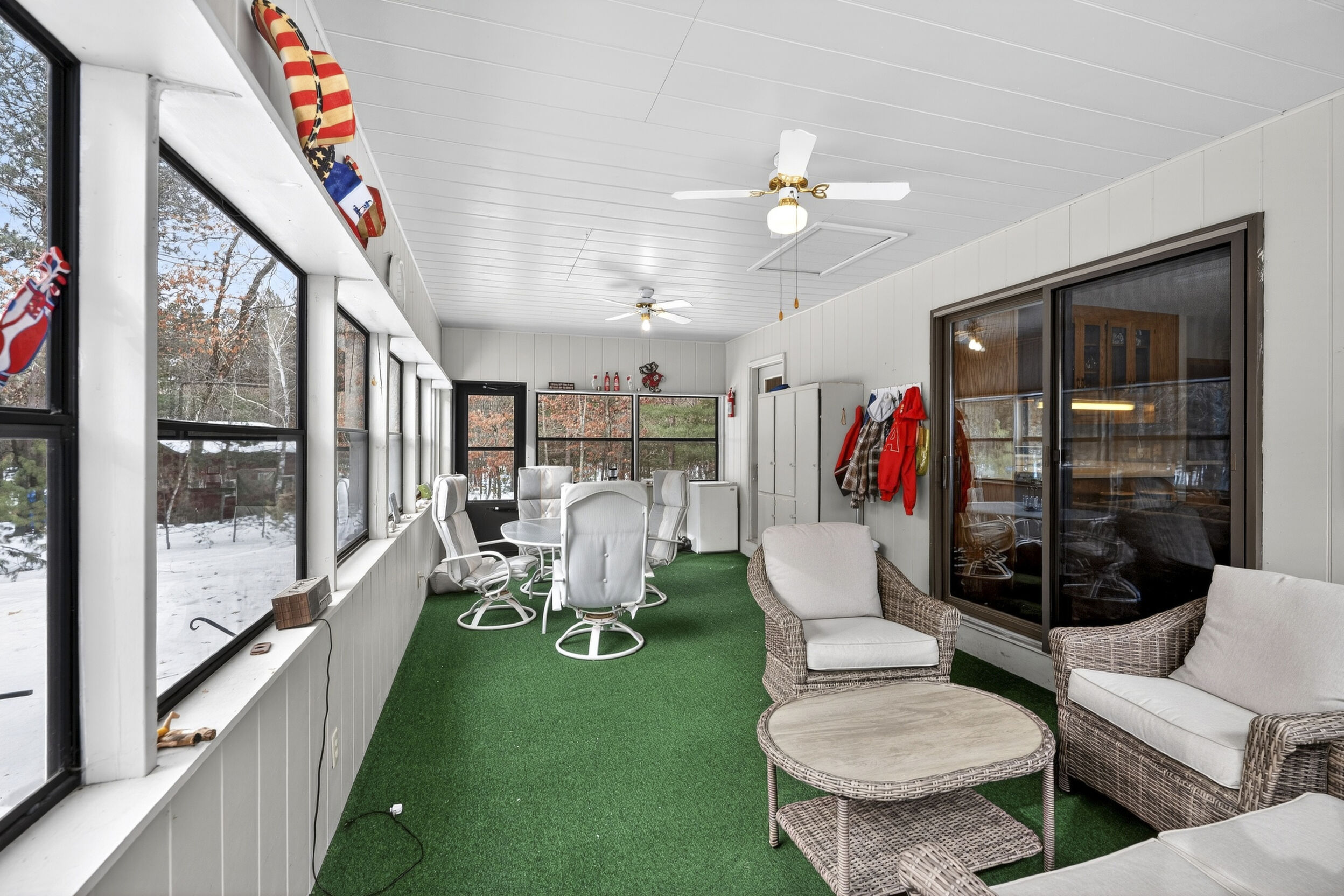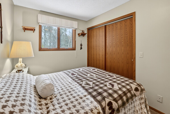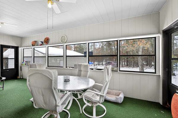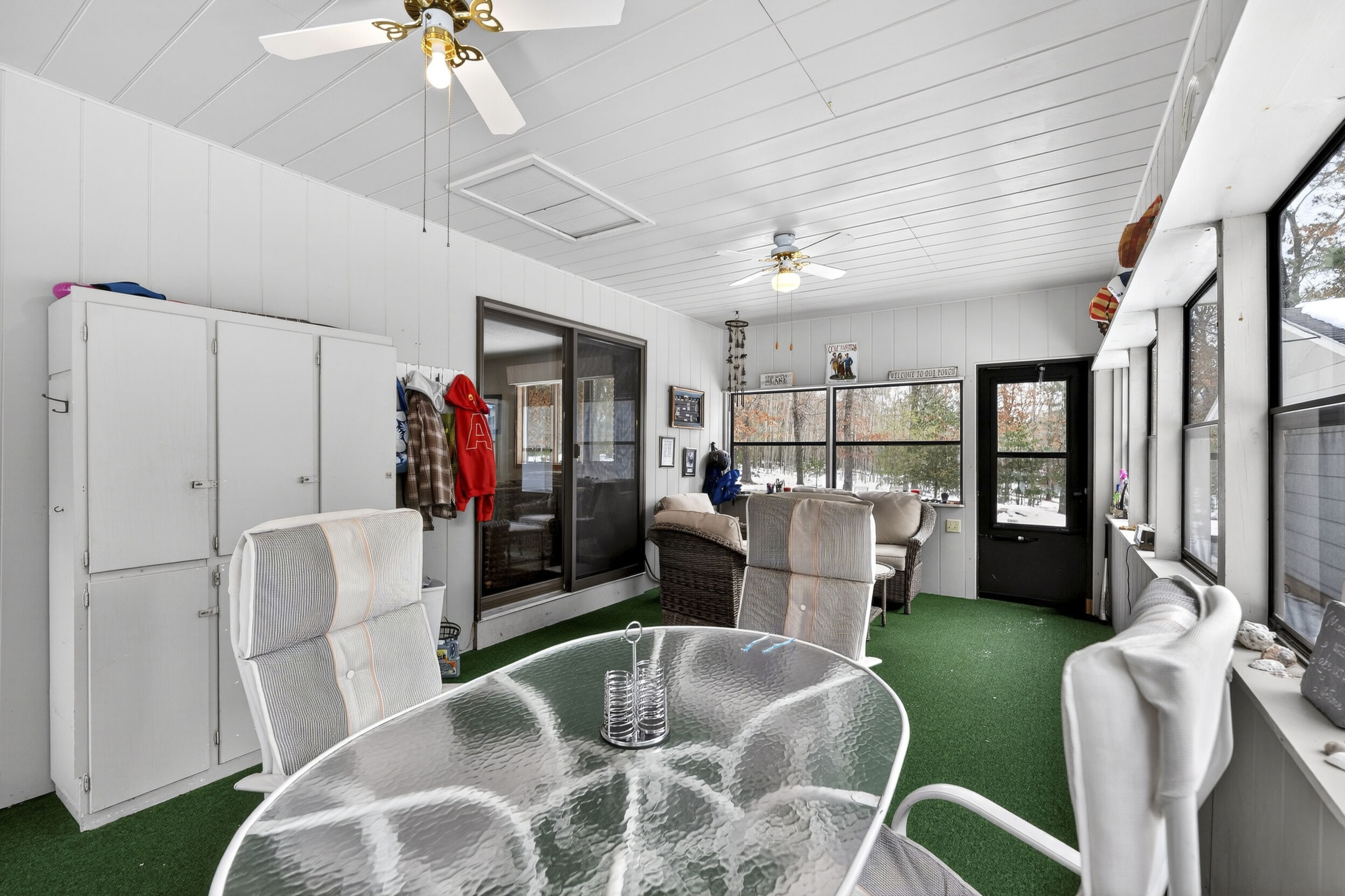 window-to-window seasonal porch—perfect for dining, card games, or lively storytelling sessions. Inside, the open kitchen with a breakfast bar flows into a living area where a cozy wood burner beckons. The main floor boasts two inviting bedrooms and a full bath with laundry options, while the lower level surprises with two family areas, an extra bedroom, and bath for visiting guests. Just a few steps away, the detached garage features dual overhead doors, capable of sheltering boats, UTV/ATV, golf vehicles or storing summer toys. Here, nature and nurture blend seamlessly, offering east Cadotte beach a couple miles away. storing canoe & kayaks on the lakeside racks or drop your boat at the launch. As a Voyager Village member