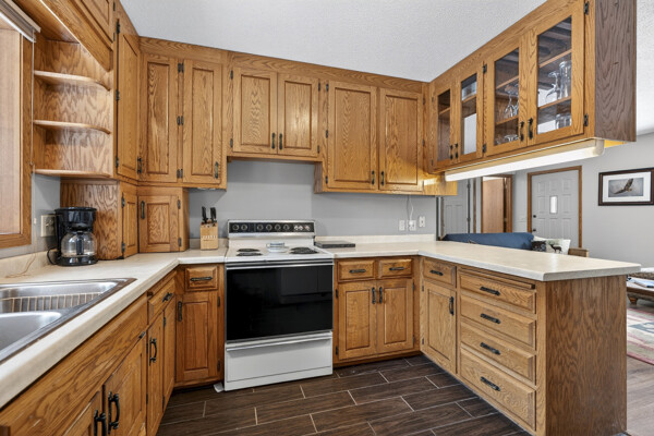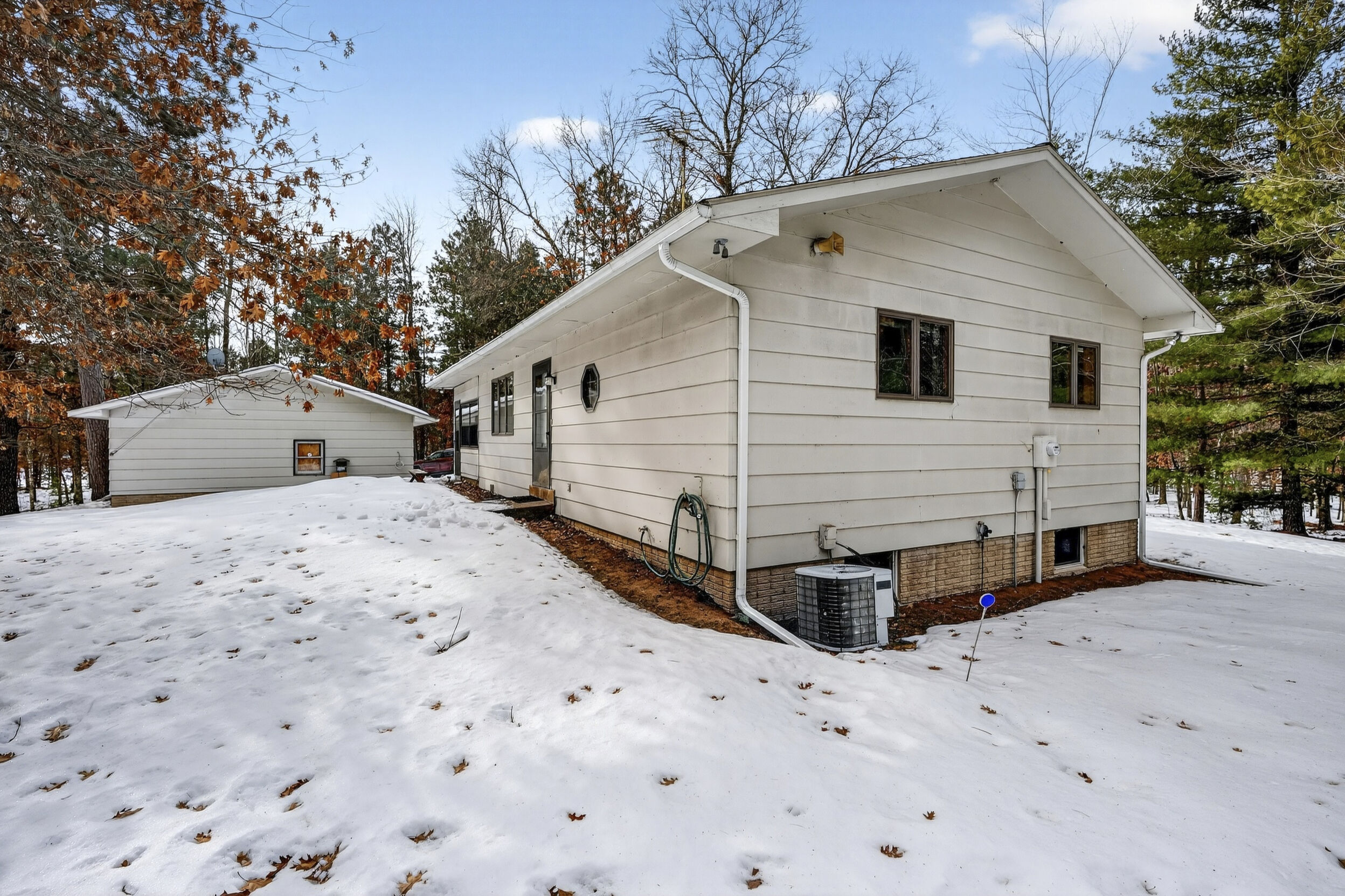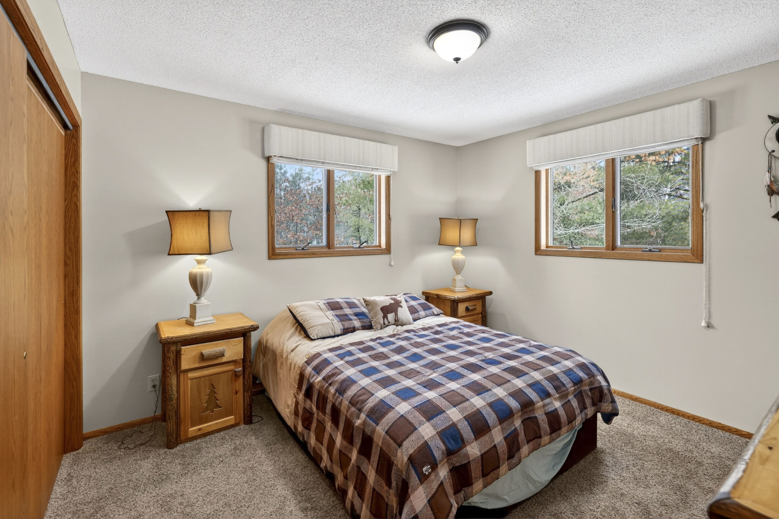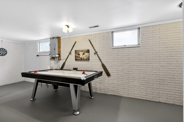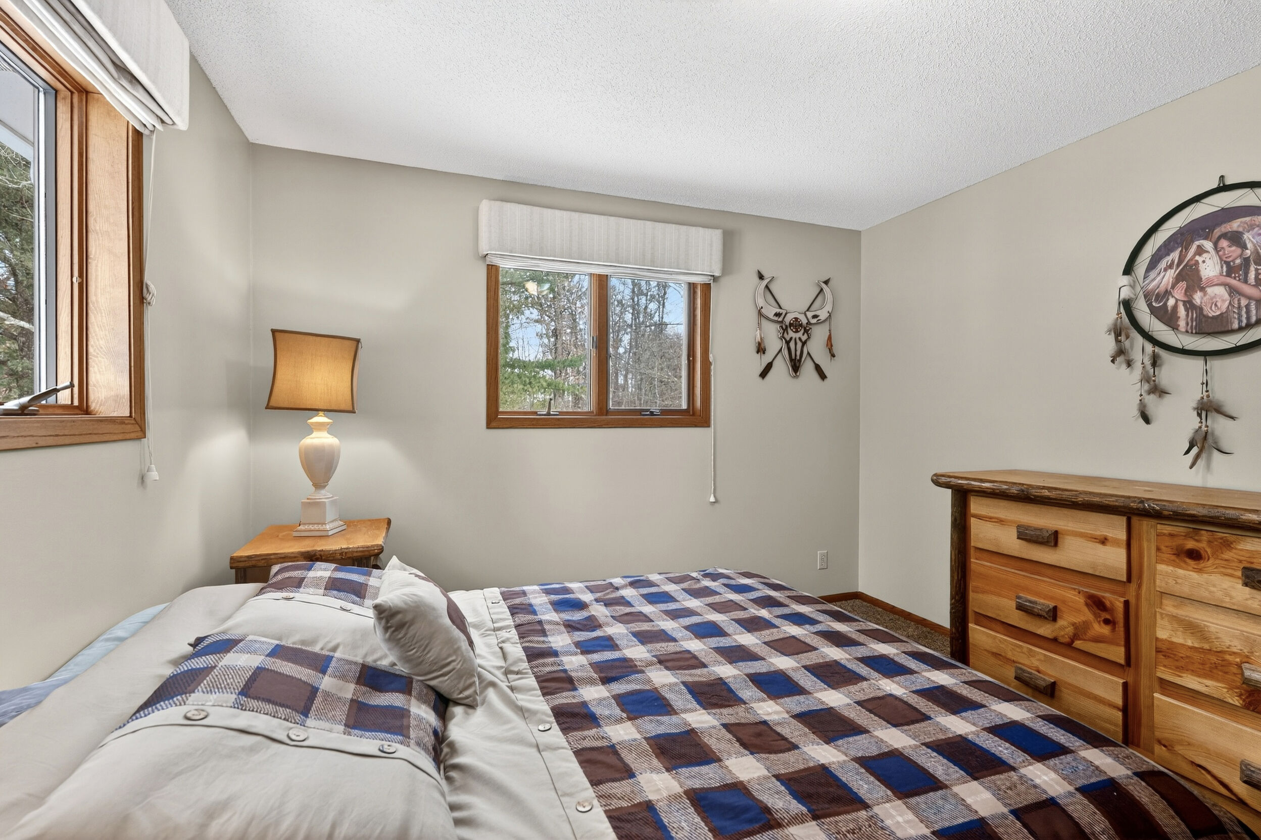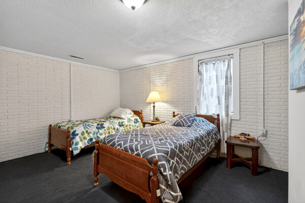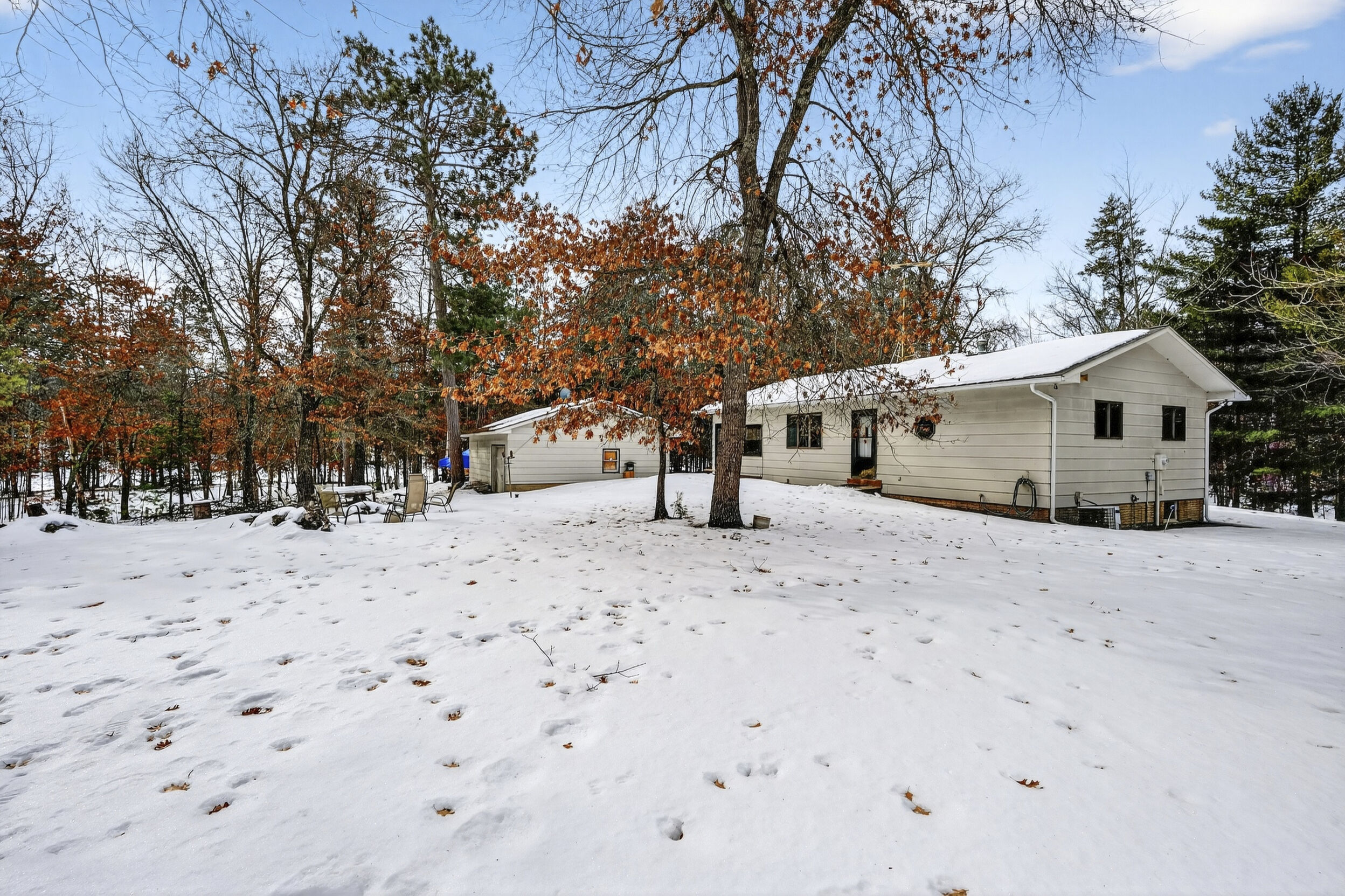 window-to-window seasonal porch—perfect for dining, card games, or lively storytelling sessions. Inside, the open kitchen with a breakfast bar flows into a living area where a cozy wood burner beckons. The main floor boasts two inviting bedrooms and a full bath with laundry options, while the lower level surprises with two family areas, an extra bedroom, and bath for visiting guests. Just a few steps away, the detached garage features dual overhead doors, capable of sheltering boats, UTV/ATV, golf vehicles or storing summer toys. Here, nature and nurture blend seamlessly, offering east Cadotte beach a couple miles away. storing canoe & kayaks on the lakeside racks or drop your boat at the launch. As a Voyager Village member