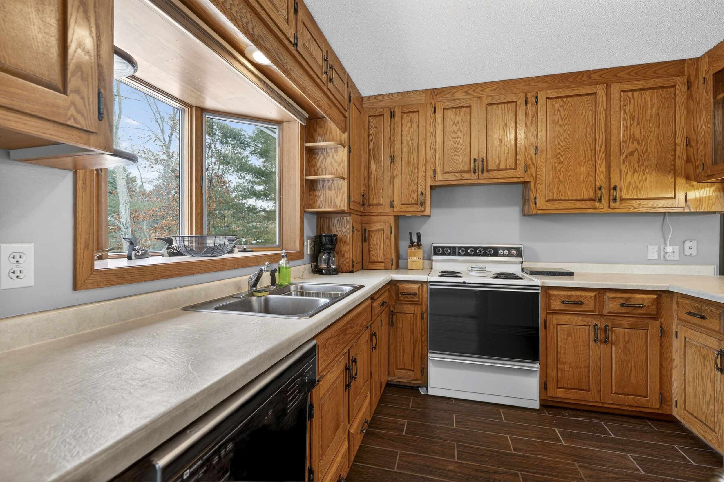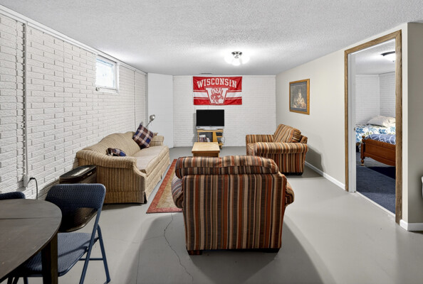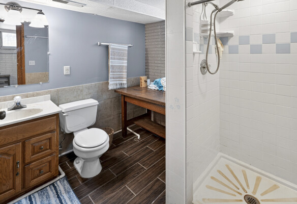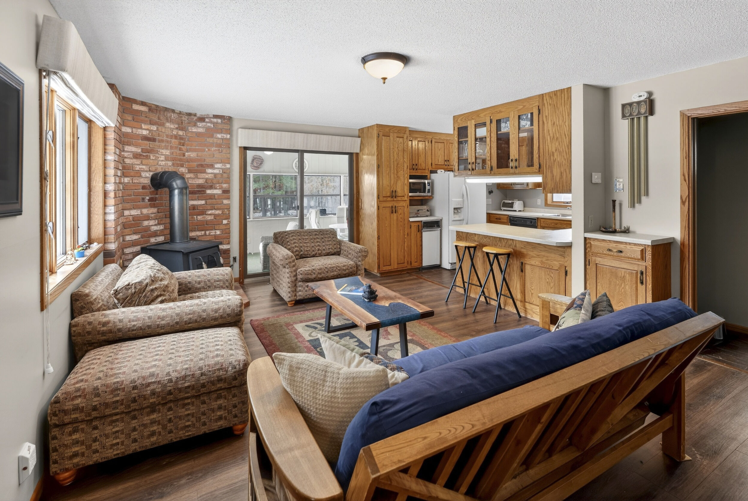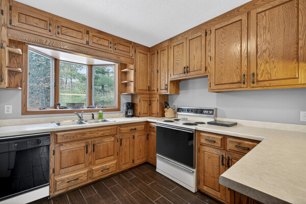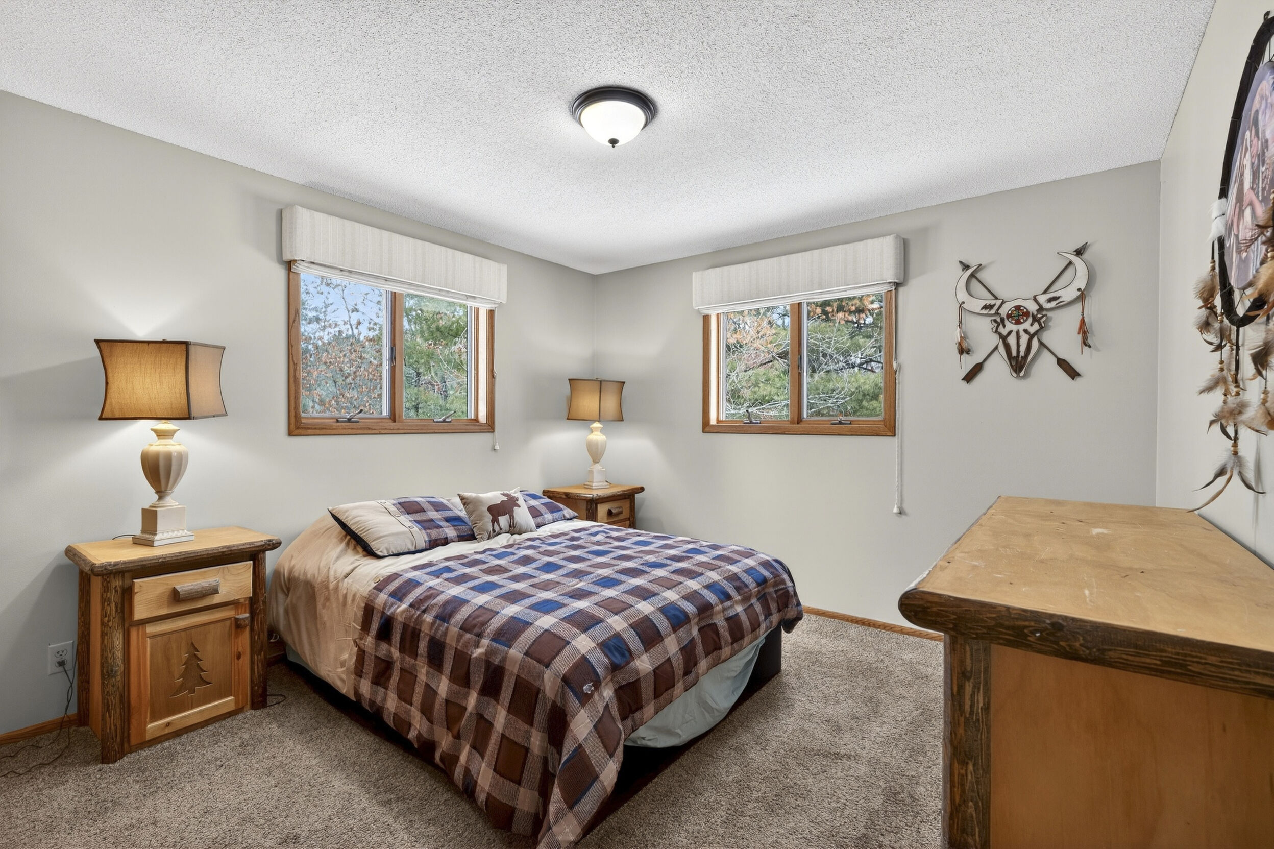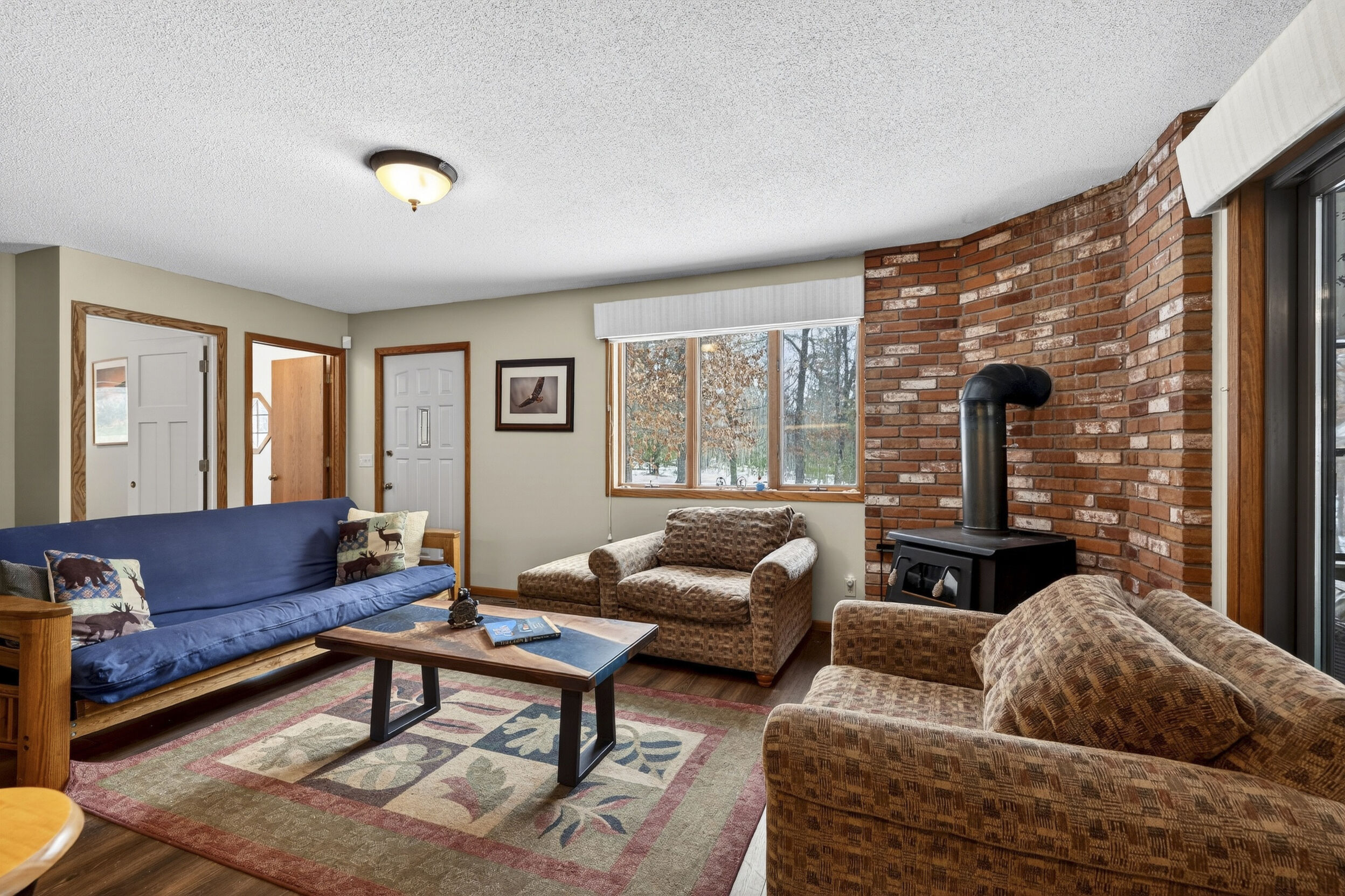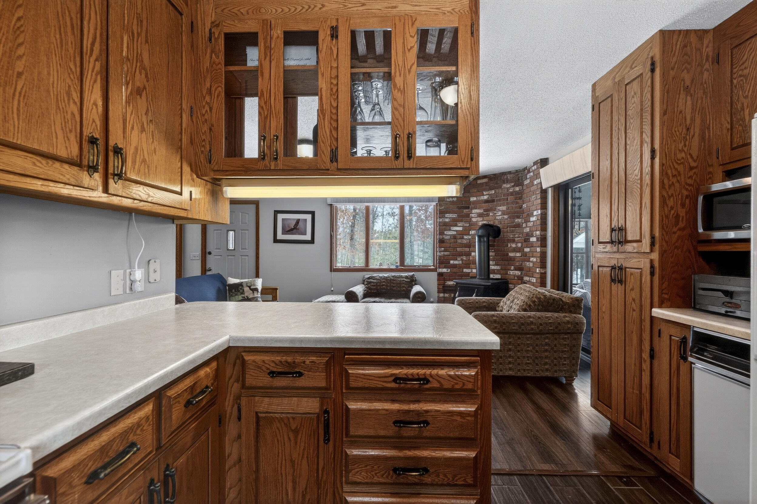 window-to-window seasonal porch—perfect for dining, card games, or lively storytelling sessions. Inside, the open kitchen with a breakfast bar flows into a living area where a cozy wood burner beckons. The main floor boasts two inviting bedrooms and a full bath with laundry options, while the lower level surprises with two family areas, an extra bedroom, and bath for visiting guests. Just a few steps away, the detached garage features dual overhead doors, capable of sheltering boats, UTV/ATV, golf vehicles or storing summer toys. Here, nature and nurture blend seamlessly, offering east Cadotte beach a couple miles away. storing canoe & kayaks on the lakeside racks or drop your boat at the launch. As a Voyager Village member