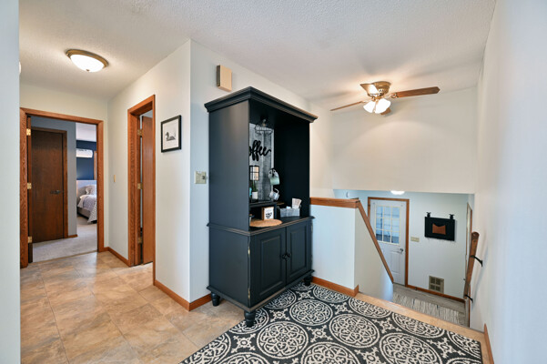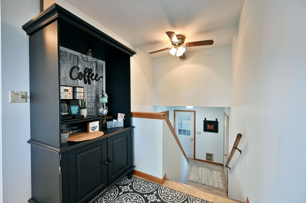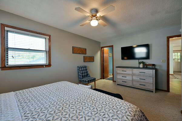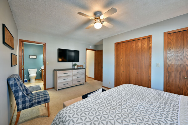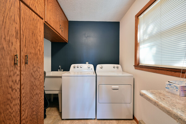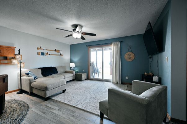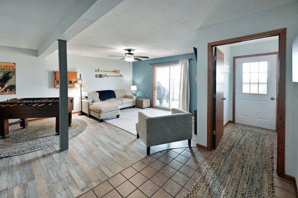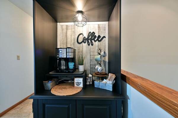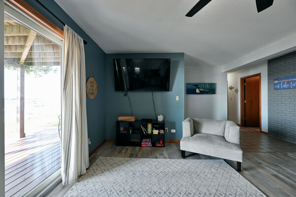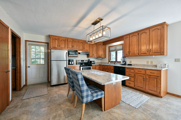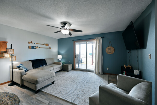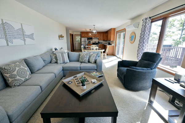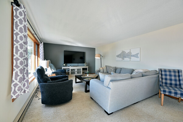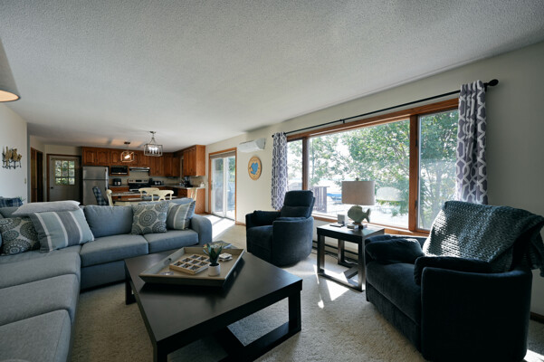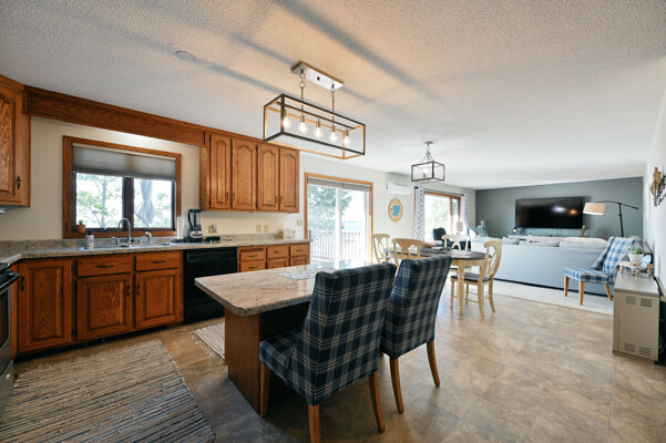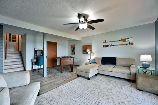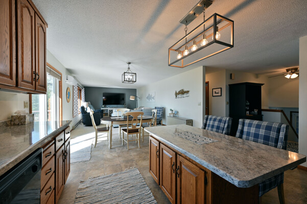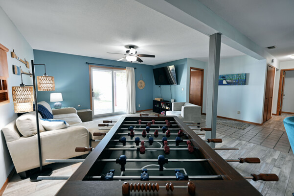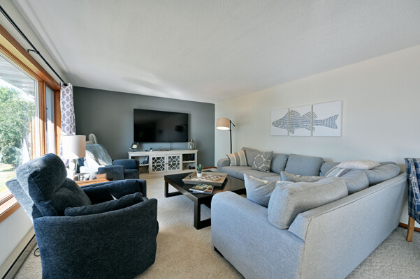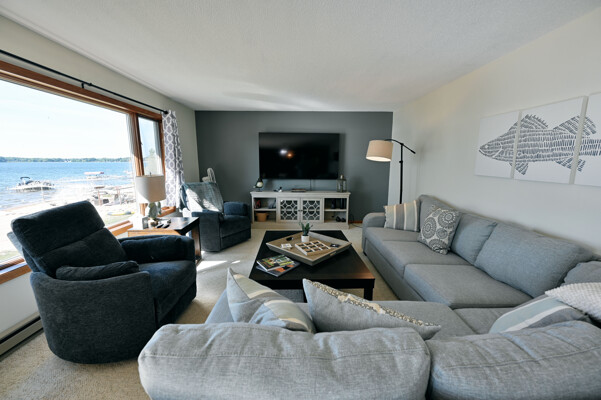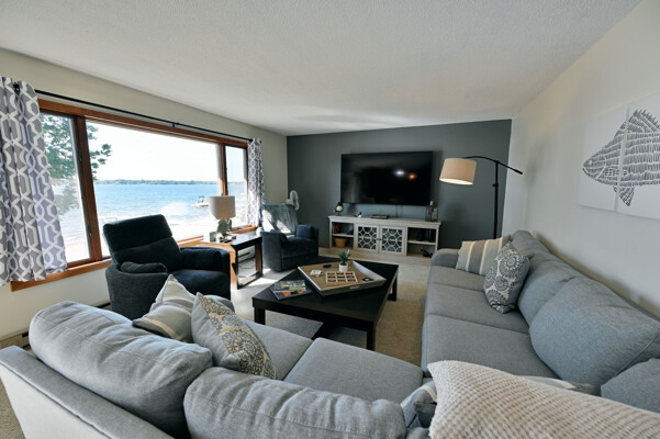 The layout for the Lively Loon lake home offers a main level master bedroom, main floor laundry, spacious kitchen, coffee bar, and a living room with big screen TV. The lower level has a family room, game area, two bedrooms, and a full bathroom.