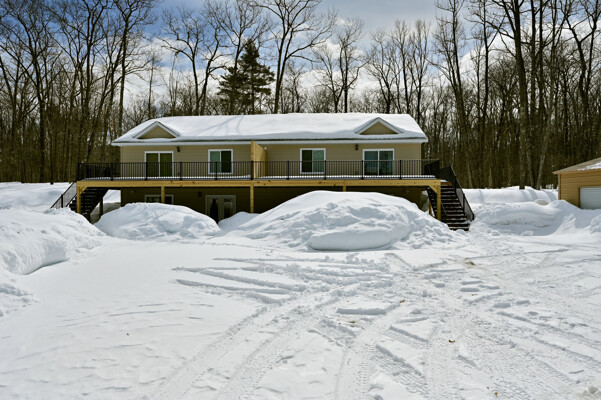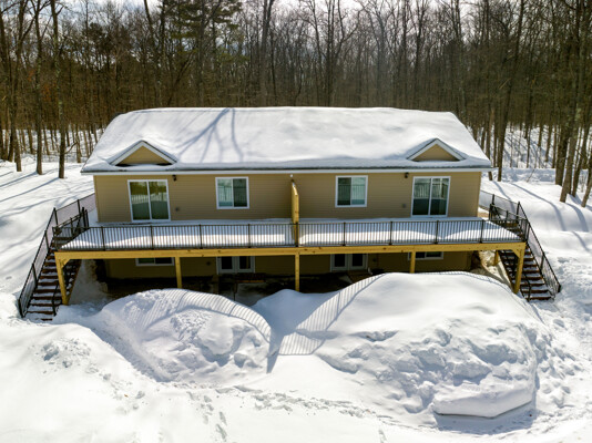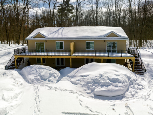 Each side has 1 bedroom, 1 bathroom and a sitting area on the lower level with 2 bedrooms, 1 bathroom and kitchen in the upper level with wrap around deck viewing Little Round Lake.