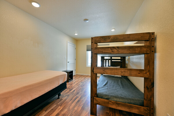 Side 1 has 2 Bedrooms with 1 Queen bed in each and 1 Bedroom with a bunk bed and twin bed. 2 Bathrooms and a kitchen.