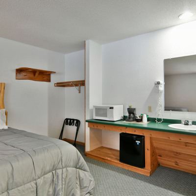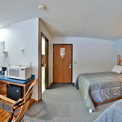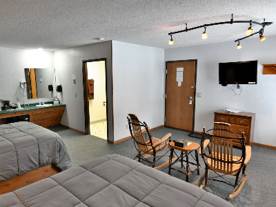 Each hotel room has 2 queen beds, full bath, air conditioning, wireless internet, clock radio, microwave, refrigerator, Cable TV, 32? flat screen TV, and hair dryer. There are two fire pits with benches and chairs and a picnic area for our guests, too.