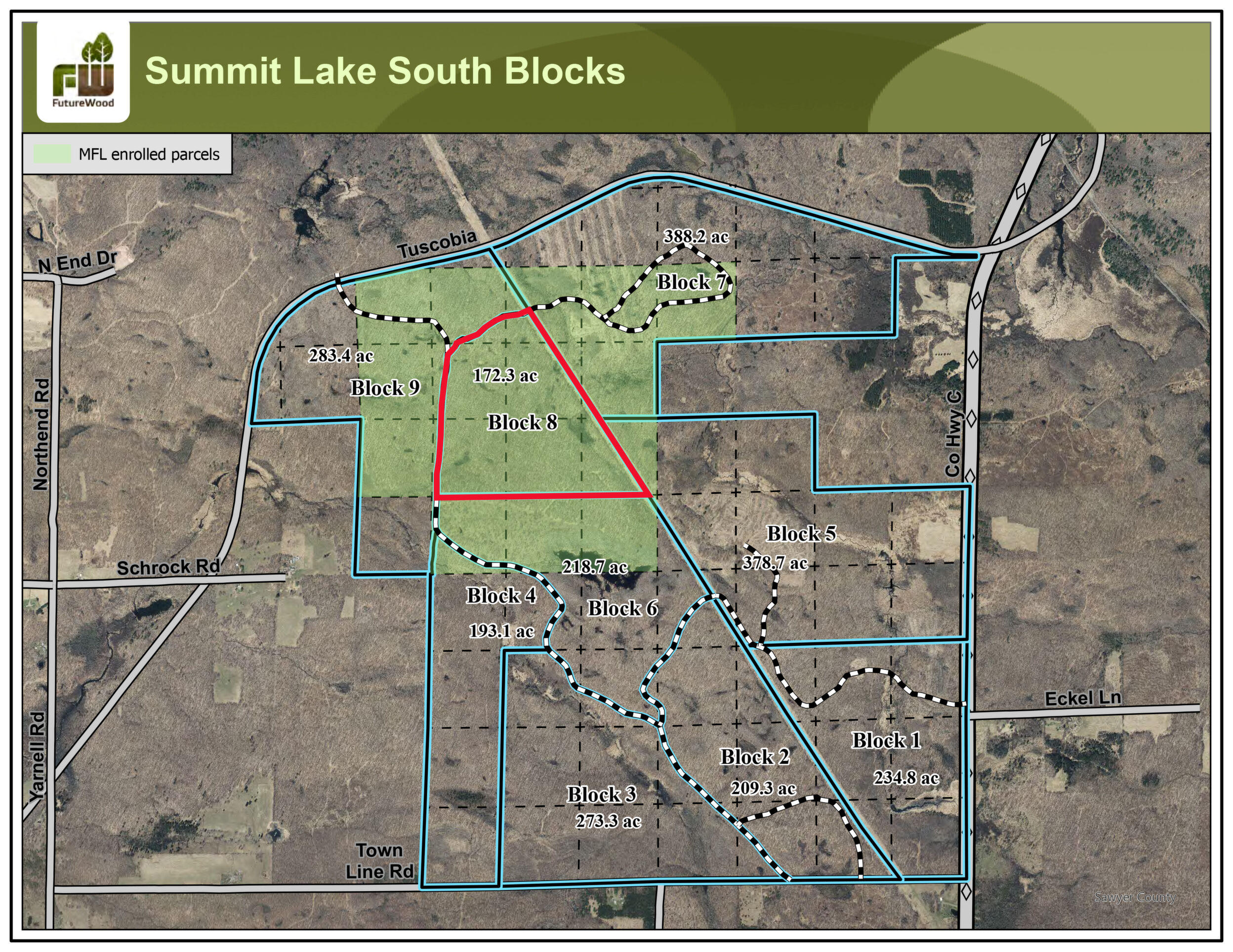 Block lies west of power line east of primary access road and south of northern loop road. Timber sale is set up (estimated $95K +/- and ready for harvest Fall of 2026 (markets and weather permitting). Most of the block is closed MFL until 2038.