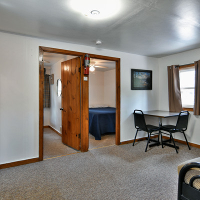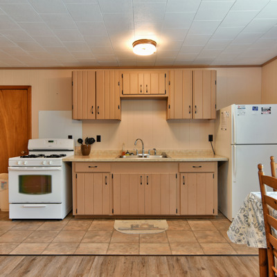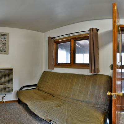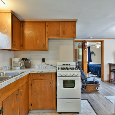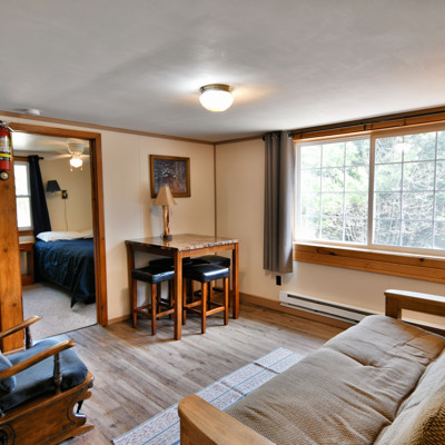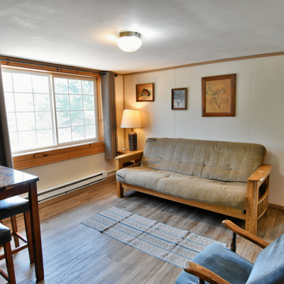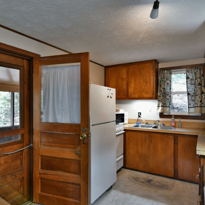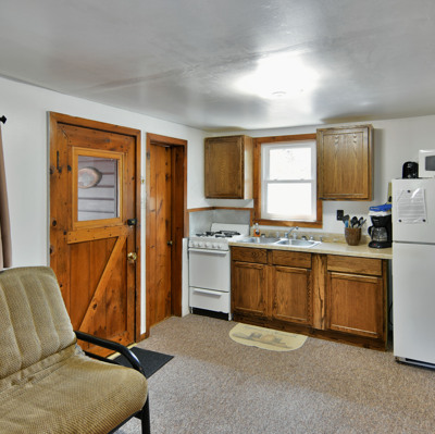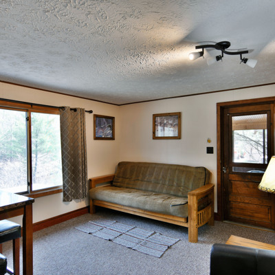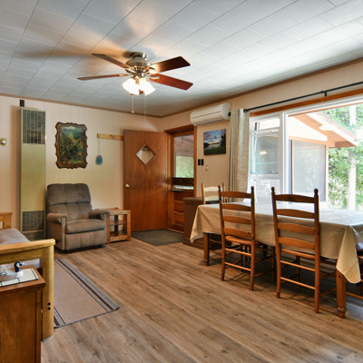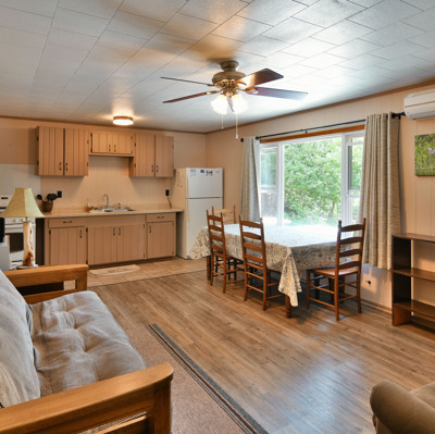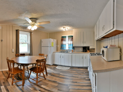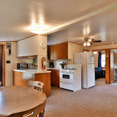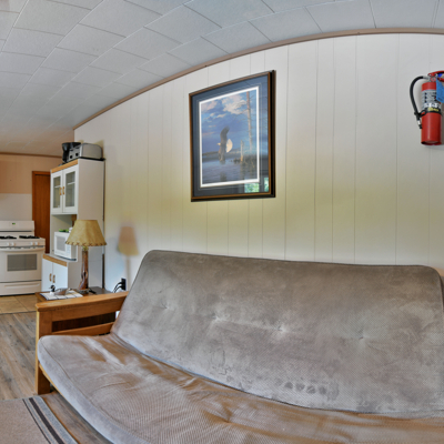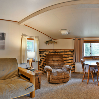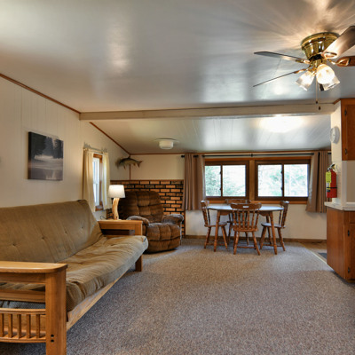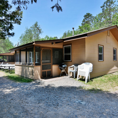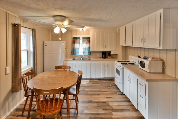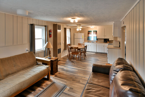 Our cottages are clean and comfortable. Each cottage has a large living area, comfortable furnishings including a fold down full size futon couch, kitchen with all utensils, oven/stove, microwave, coffee pot, crockpot, fridge, full bathroom with shower, carpeted floors and screened porch. All of our cottages have outdoor chairs, picnic table, grill and fire pit. One dock with electricity is provided for each cottage.