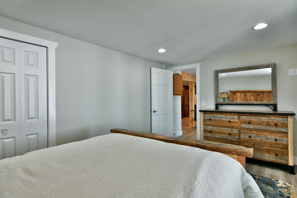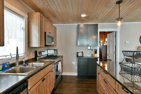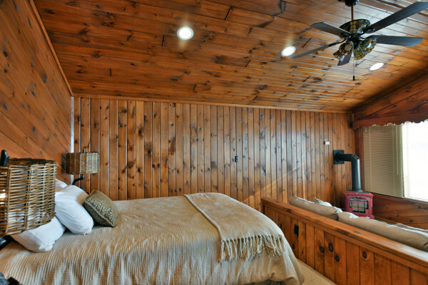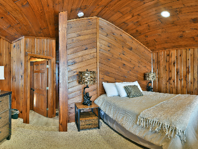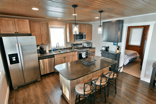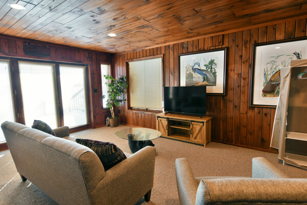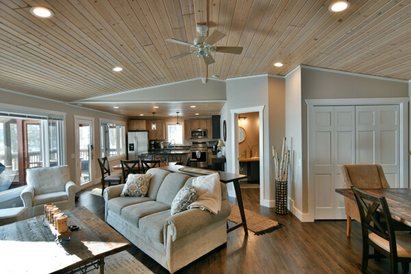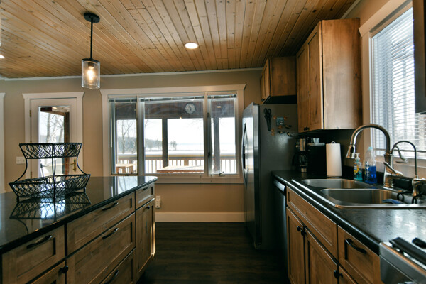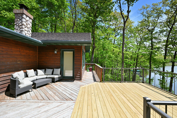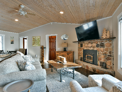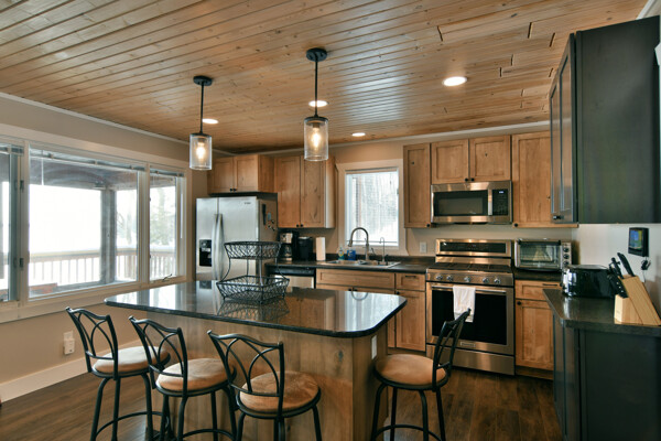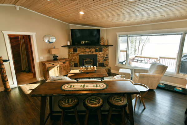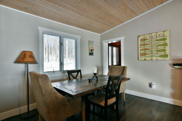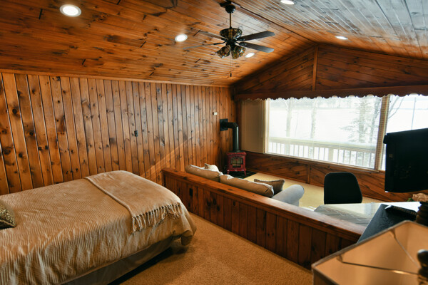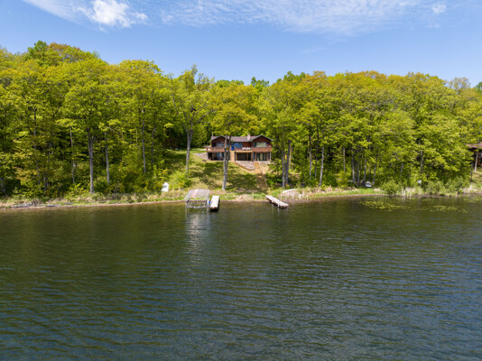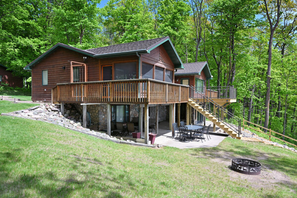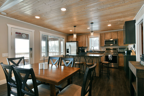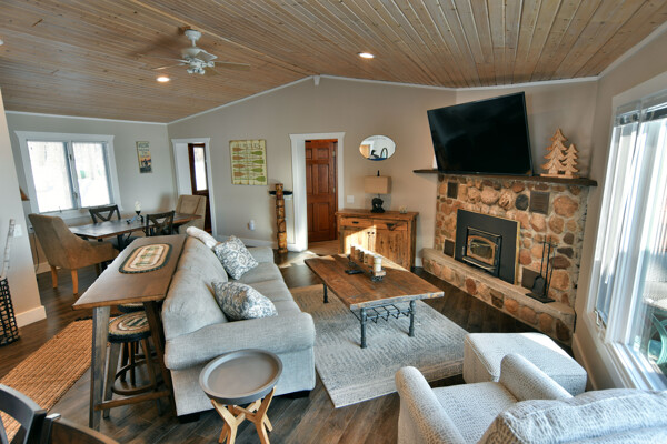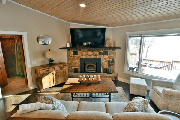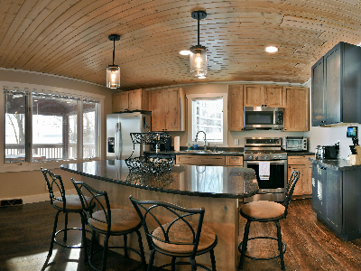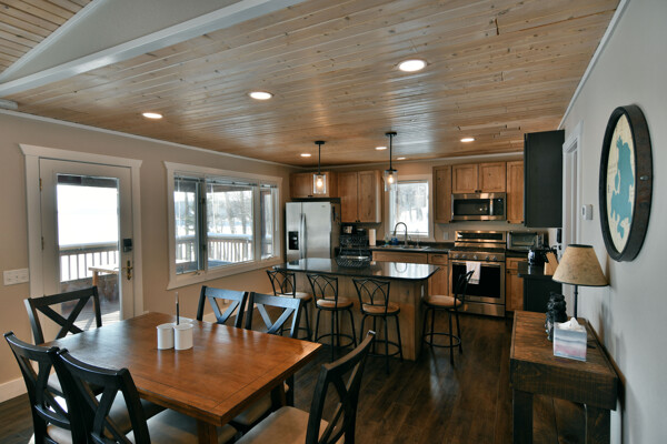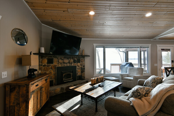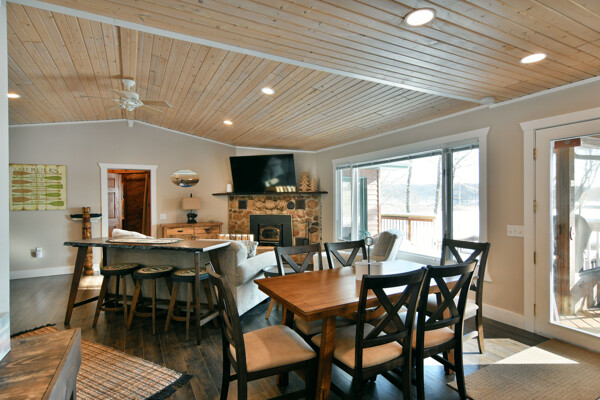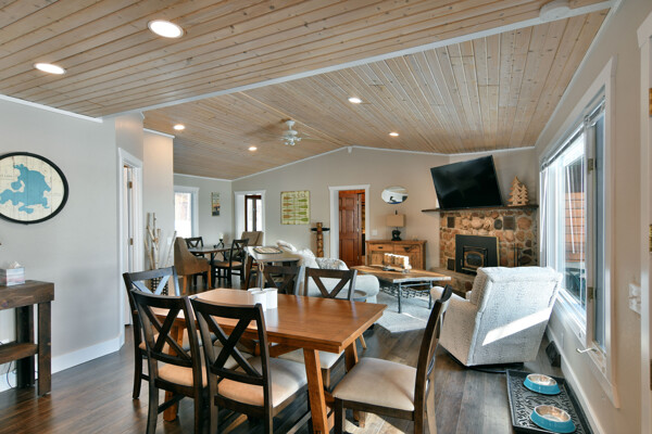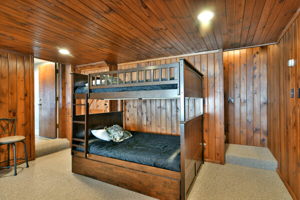 The walkout lower level features an open lakeside family room with bunk beds, kitchenette, large bath and another bedroom with views of the lake.