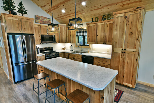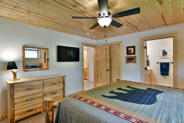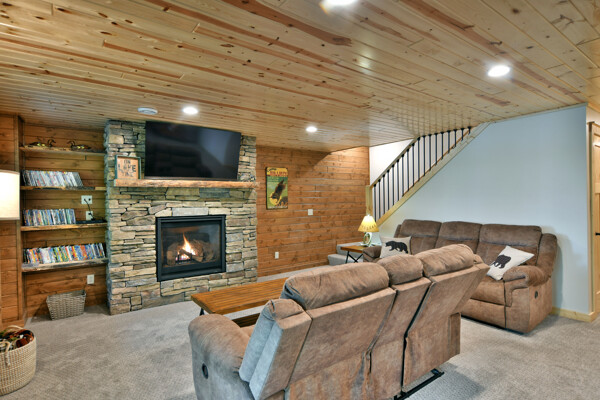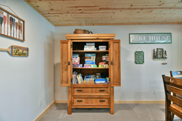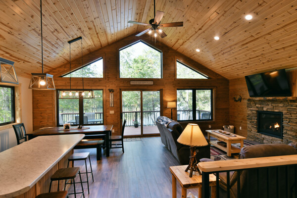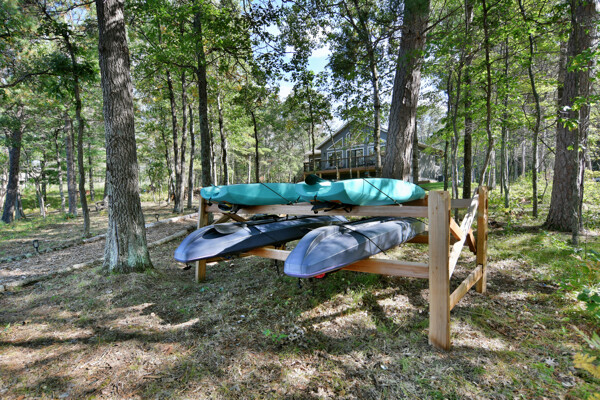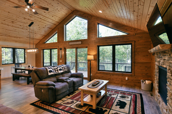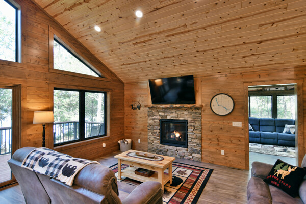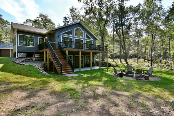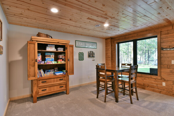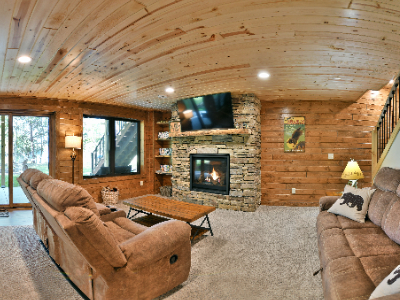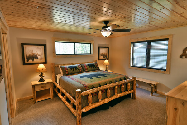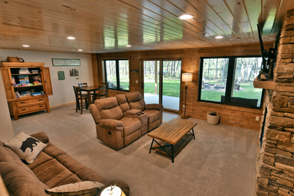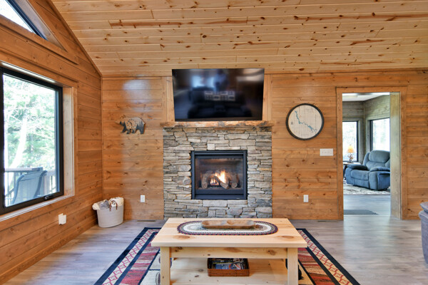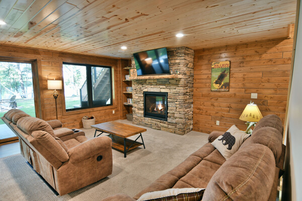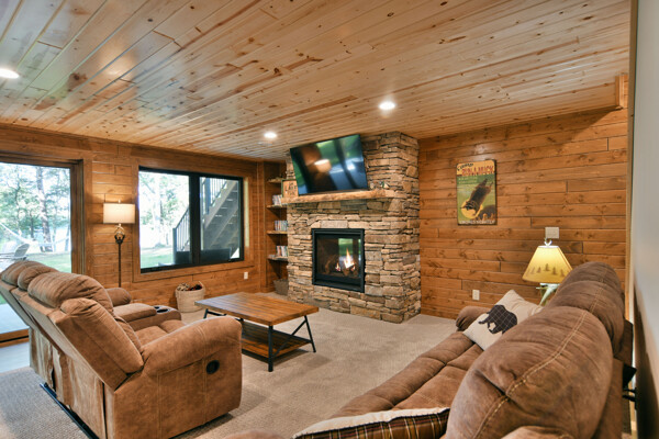 River Road Lodge- This beautiful 4 bedroom/3 bathroom cabin has been tastefully decorated for renters to enjoy! Everything has been thought of to ensure our renters can simply show up and enjoy their family/friend gathering. The main level consists of a large 4 season sitting room, living room with gas fireplace, large kitchen, queen bedroom, common bathroom, master bedroom/bathroom with king size bed. The lower level consists of a large family room with gas fire place, hutch filled with games, large bedroom with twin over full bunk bed, common bathroom, large bedroom with queen bed and futon and a laundry room equipped with washer, dryer and iron board. The backyard is level, perfect for yard games and large gatherings. Enjoy a fall evening fire in our fire pit or enjoy a quiet paddle in one of our four kayaks that are provided. Enjoy the Trego Nature Trail that is located 1 mile from the property.