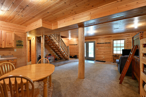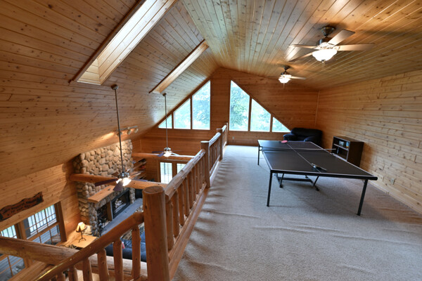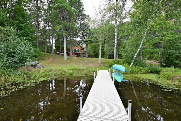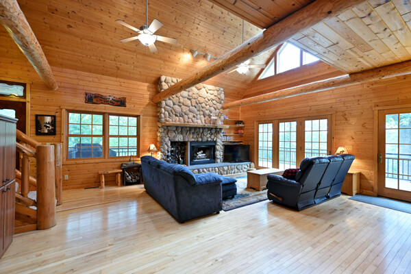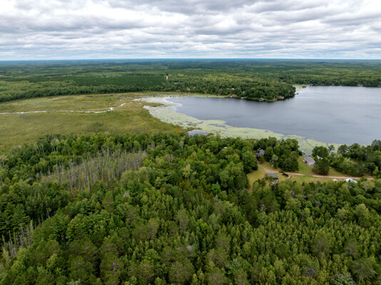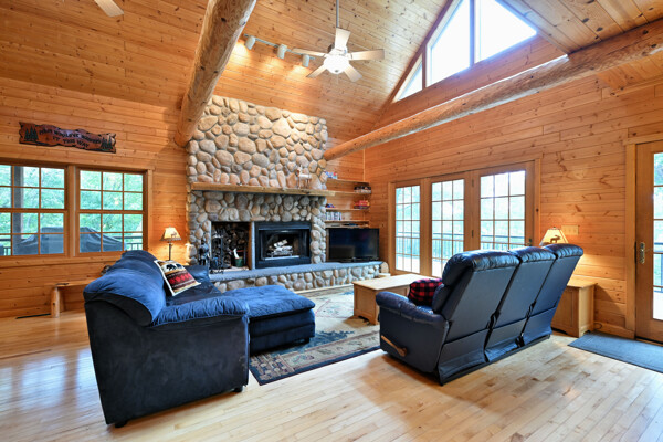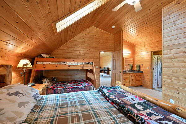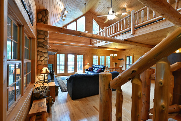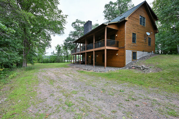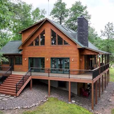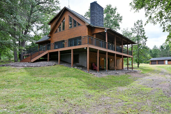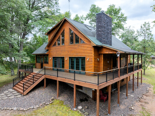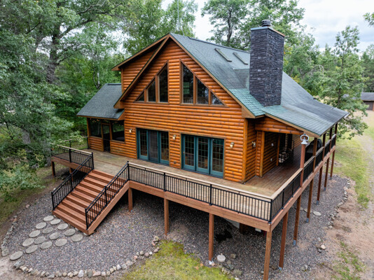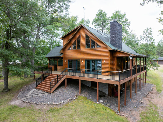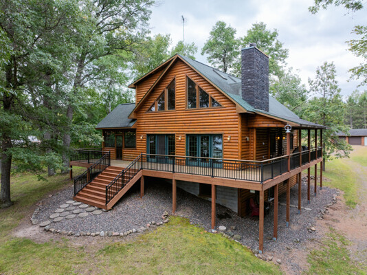 Discover a rare Northwoods retreat on 25 wooded acres with 1,567 feet of frontage on Lower McKenzie Lake. This beautifully crafted log-style chalet offers 4 bedrooms and 3 baths, featuring exposed log beams, a soaring great room with a stunning stone wood-burning fireplace, and a loft that overlooks the living space. The master suite in the loft provides a private escape, while the spacious finished lower level is perfect for guests and gatherings. Step outside to a rebuilt deck and railing that showcase panoramic views of the lake and surrounding forest. With abundant privacy, this property is bordered by Washburn County forest land-ensuring endless opportunities for recreation right out your back door. Hunt, fish, boat, and explore the northwoods, all from your own property. This is more than a cabin-it's a once-in-a-lifetime setting that combines acreage, water frontage, and Northwoods lifestyle in one exceptional offering.