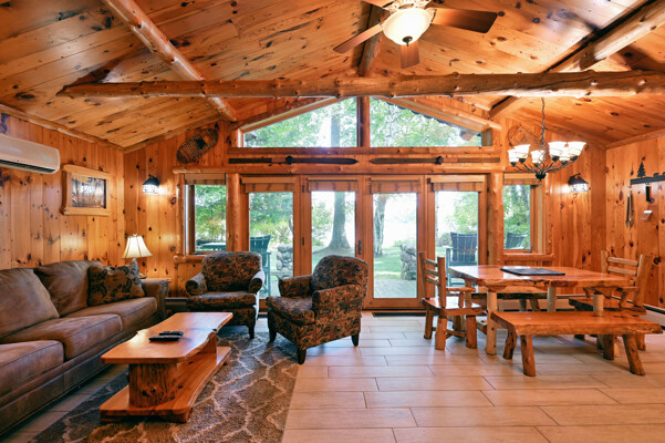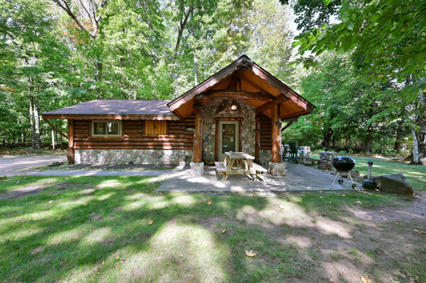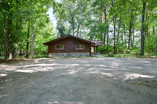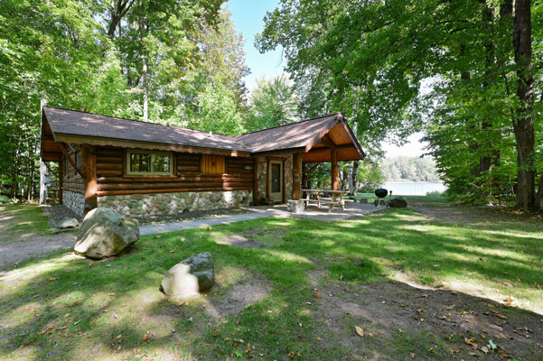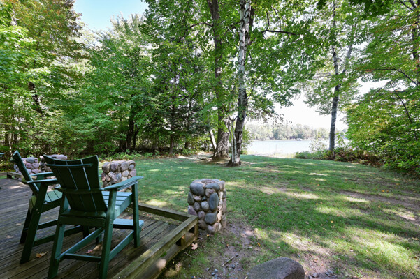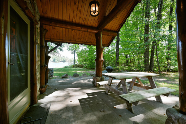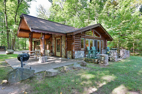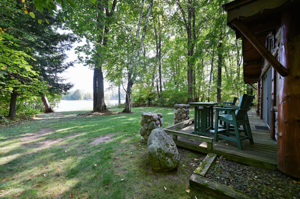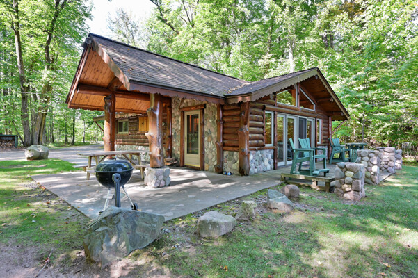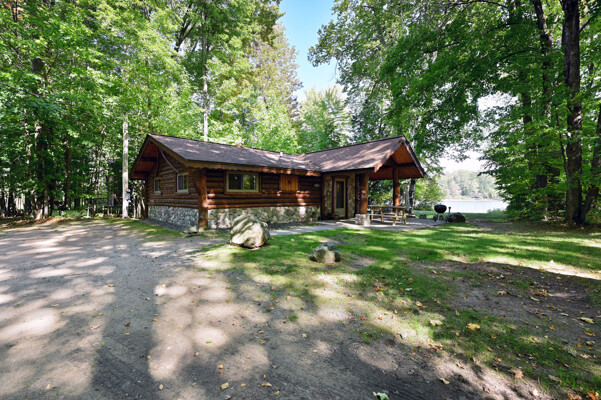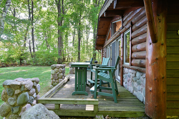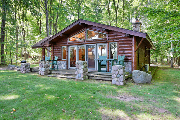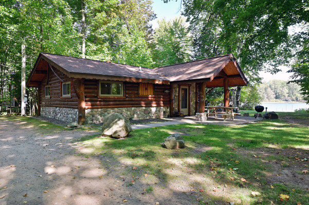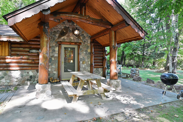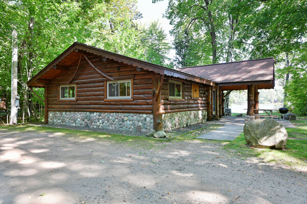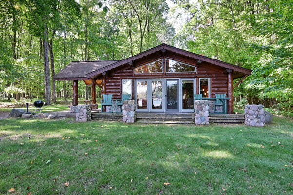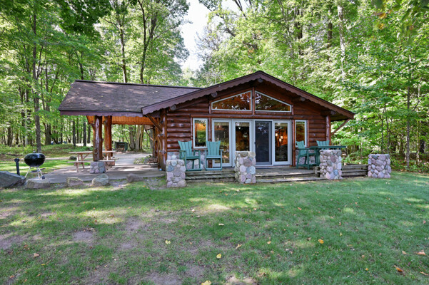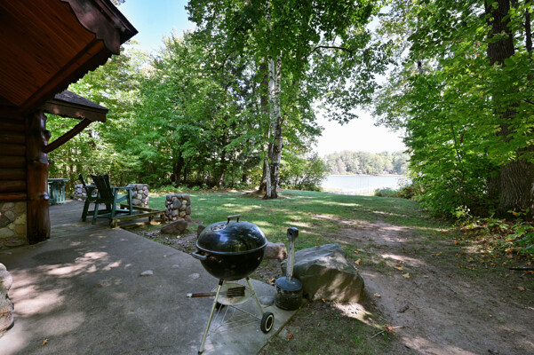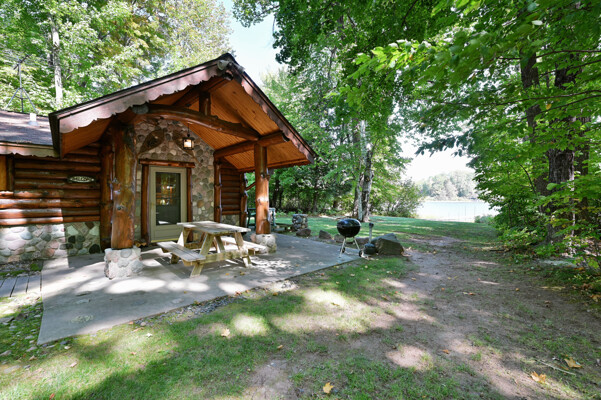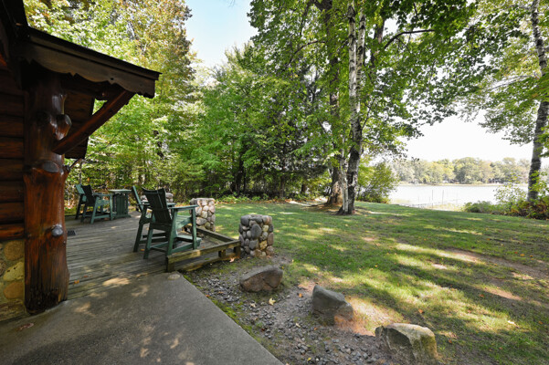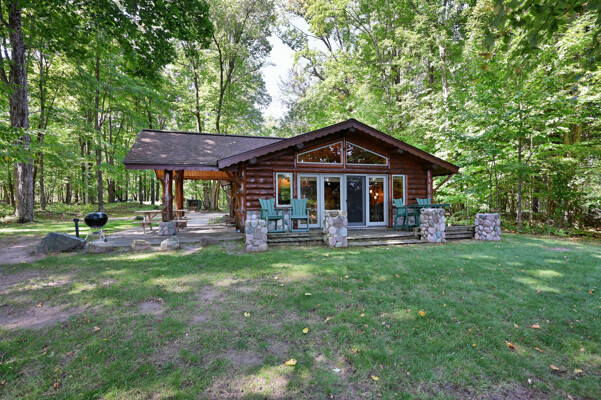 The charming log cabin features stone accents, covered log entryway and walkout lakeside deck complete with stone pedestals and log railings. Relax or dine on the wooden deck with its delightful Northwoods lake view, picnic table and BBQ charcoal grill.