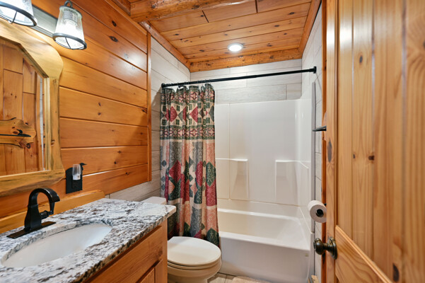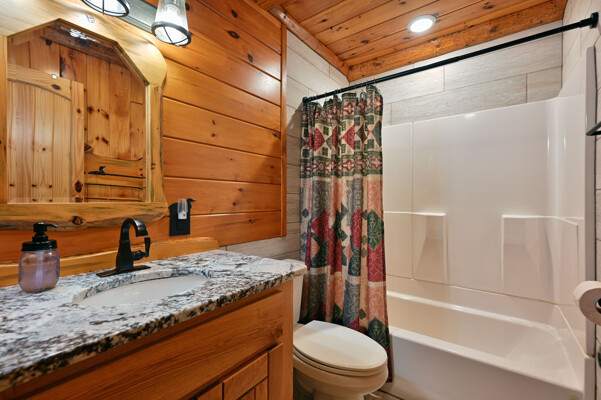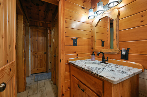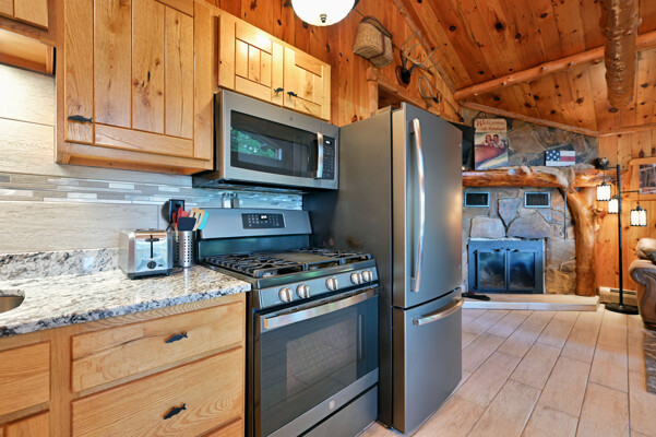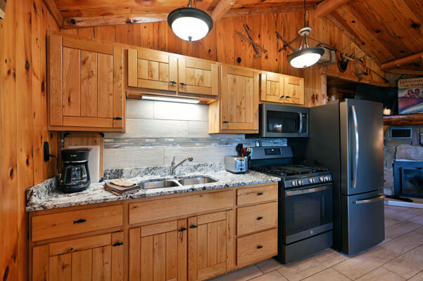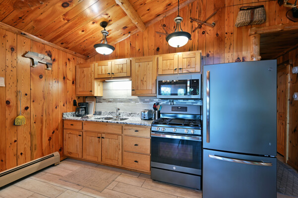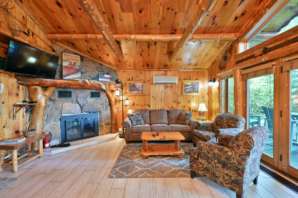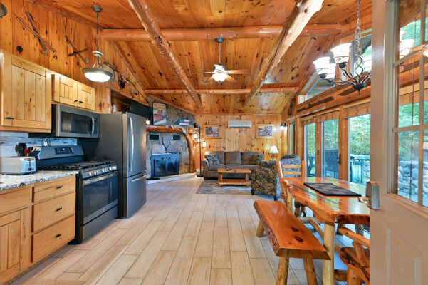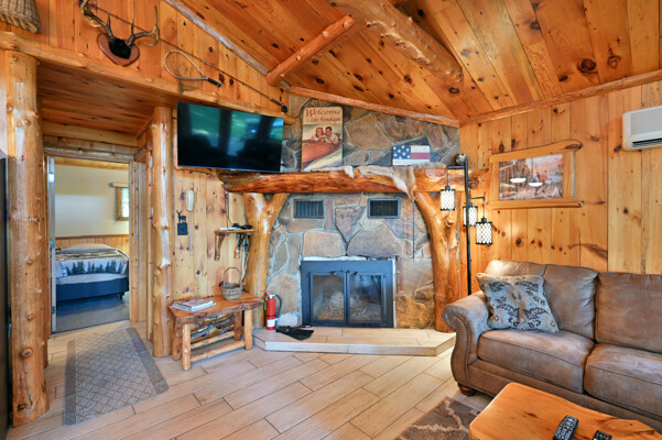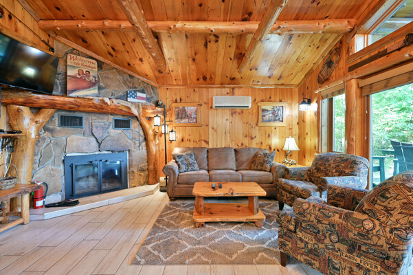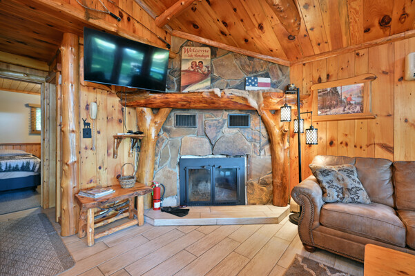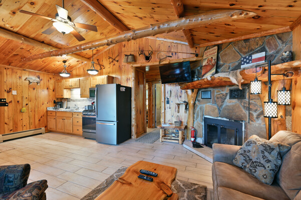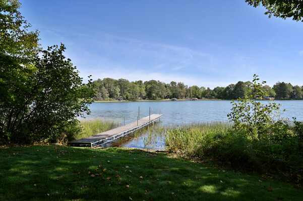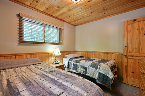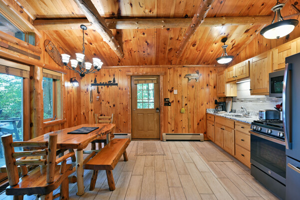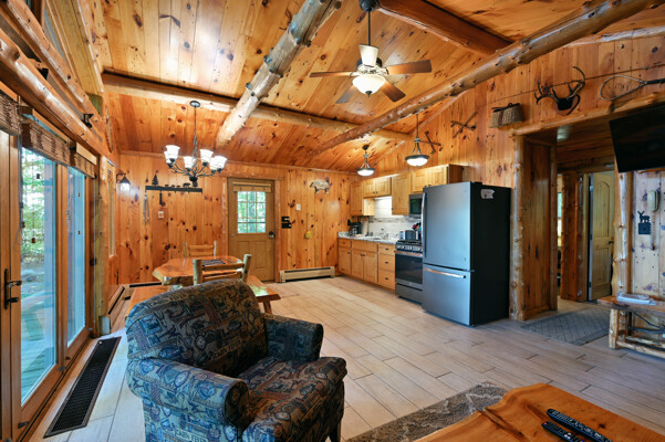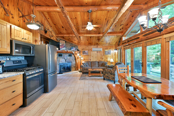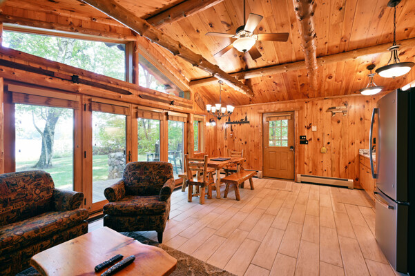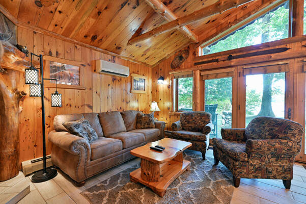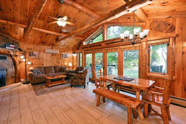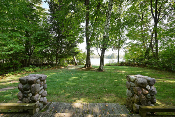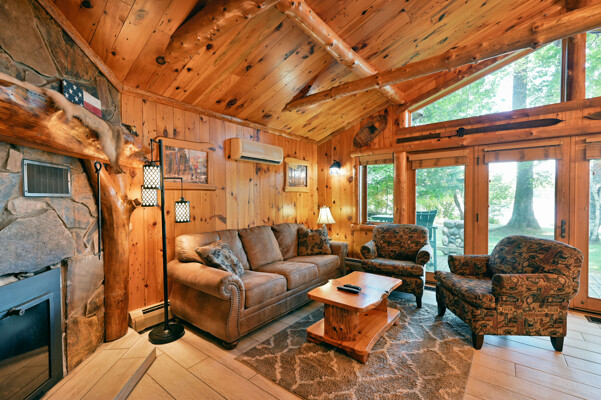 The charming log cabin features stone accents, covered log entryway and walkout lakeside deck complete with stone pedestals and log railings. Relax or dine on the wooden deck with its delightful Northwoods lake view, picnic table and BBQ charcoal grill.