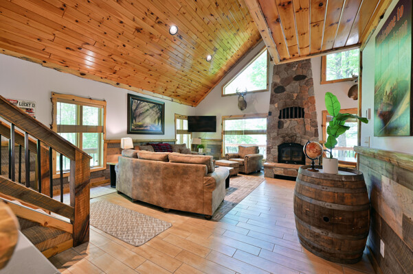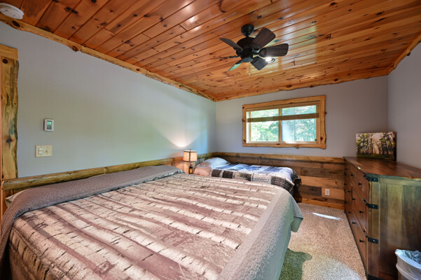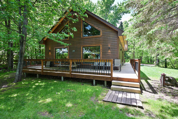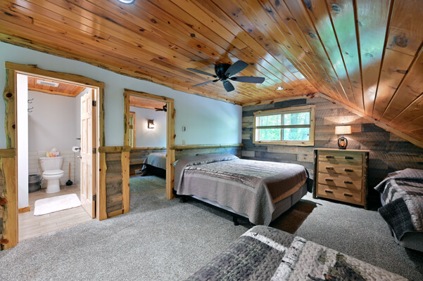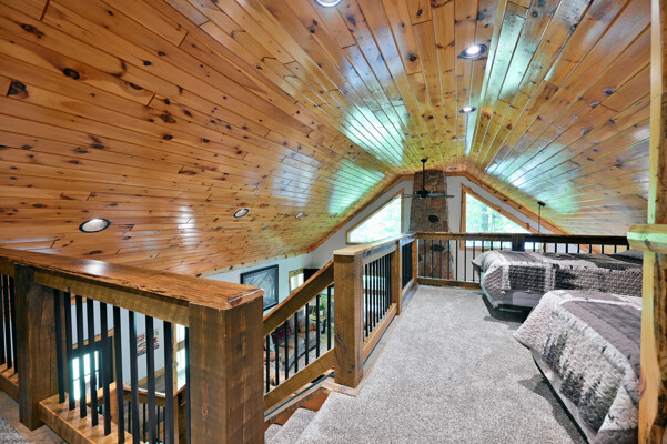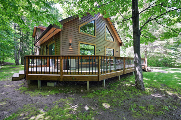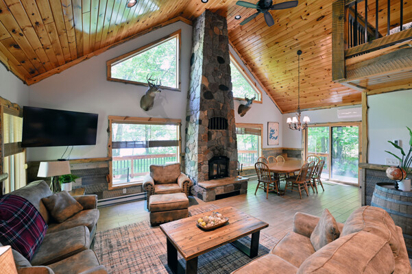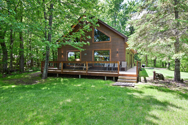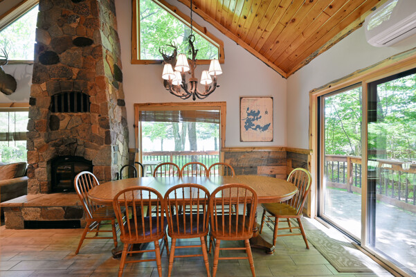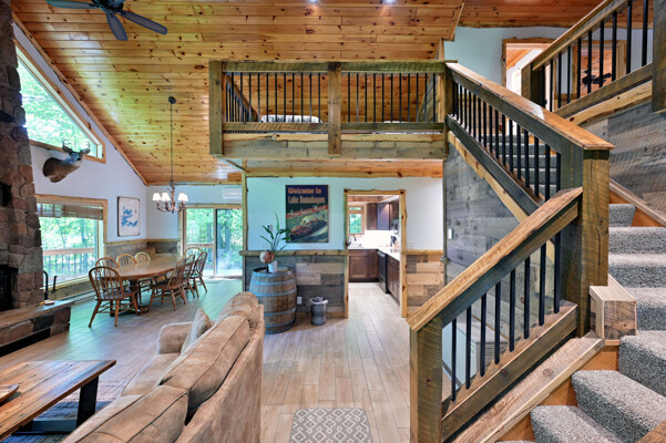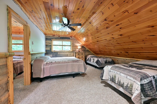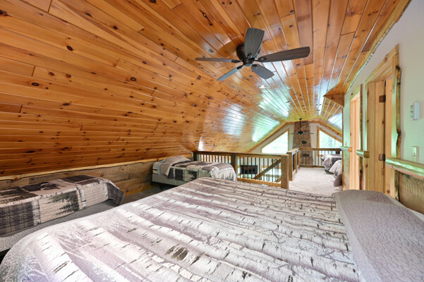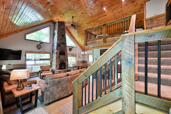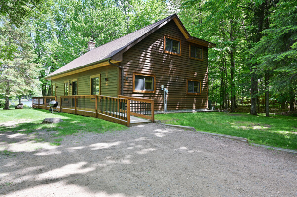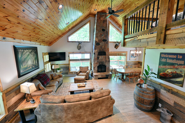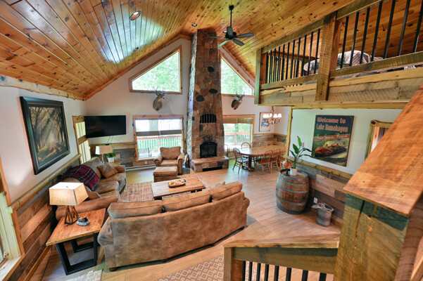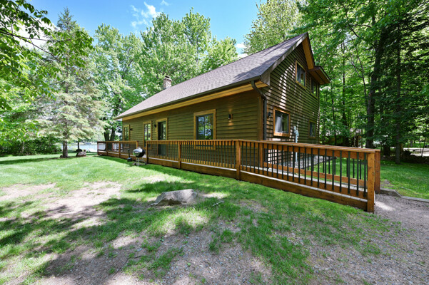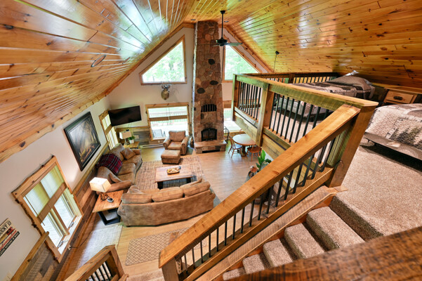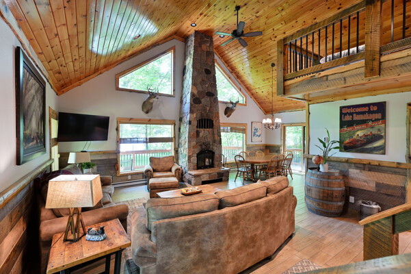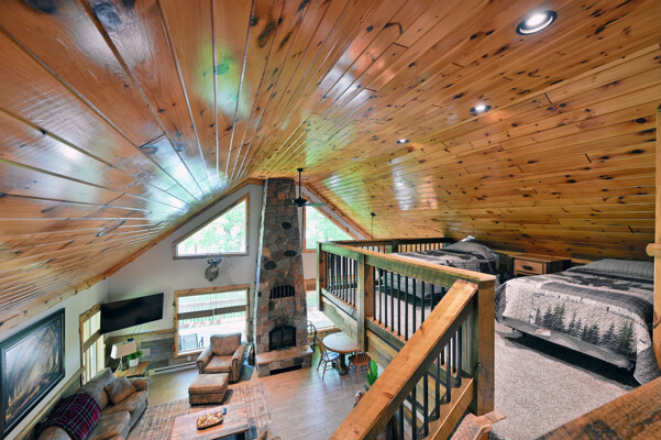 Bayview Loft has 400 feet of beautiful lake frontage, large wrap around deck and is handicap accessible. Cedar exterior and knotty pine interior with two-story, split stone fireplace. 2800 square feet of living space with 3 bedrooms (10 beds), large loft and spacious kitchen, phone, Cable TV.