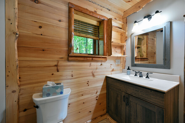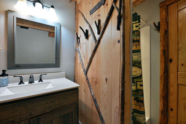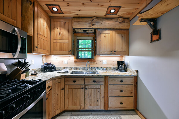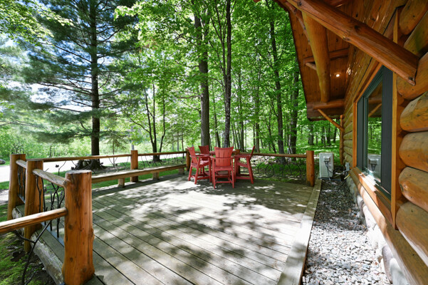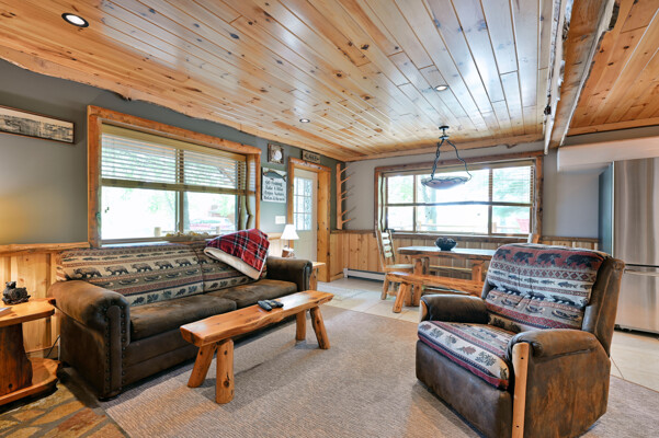 TOTAL MAKEOVER. The Birch Suite is a newly remodeled 1 bedroom, 2 bath suite conveniently located next to our Main Lodge! The charming retreat has a large, tiered wooden deck with built in benches and beautiful custom log and wrought iron posts and railings with covered entryway.