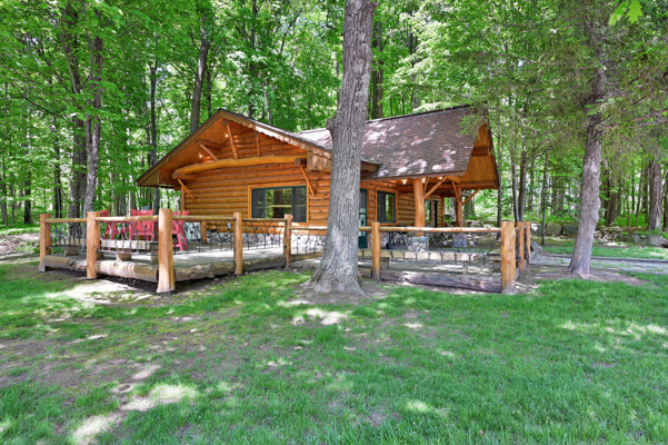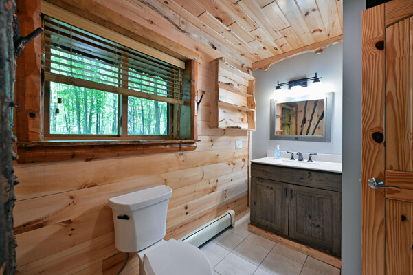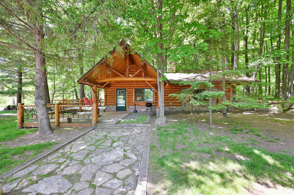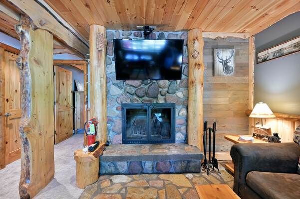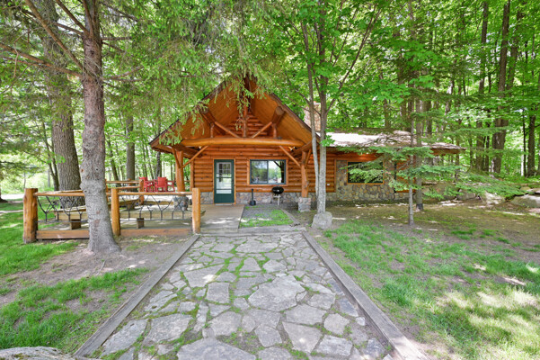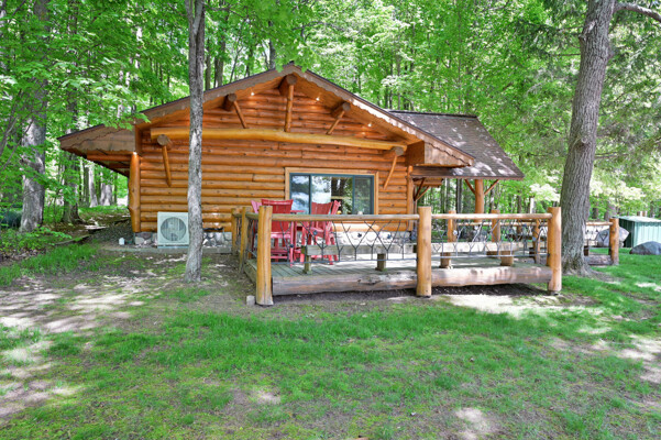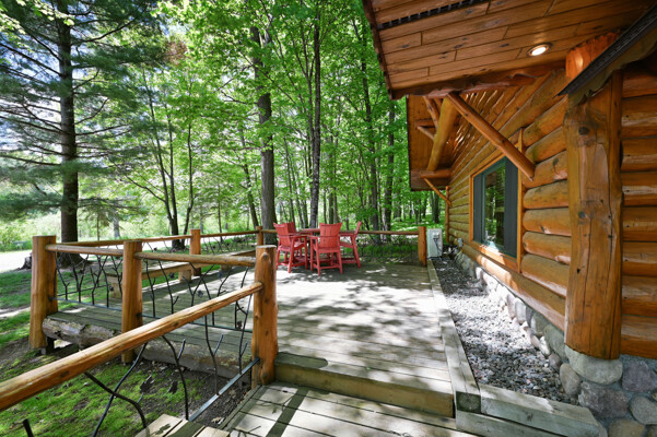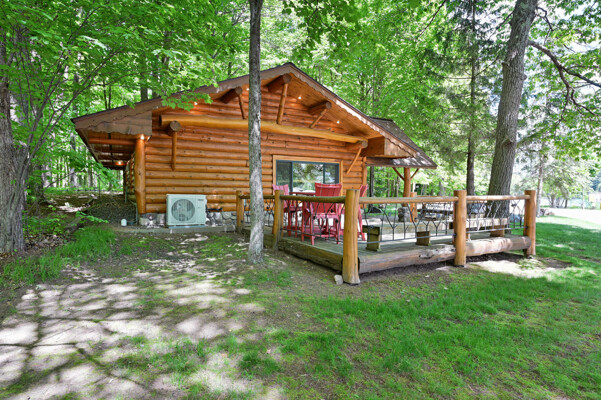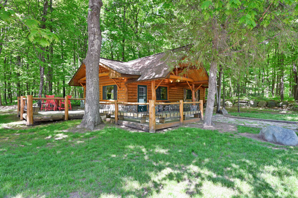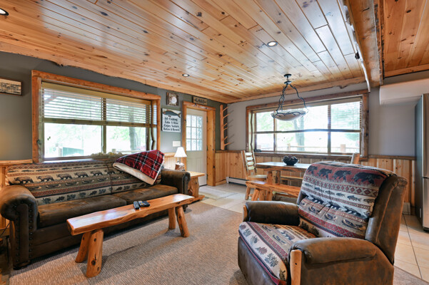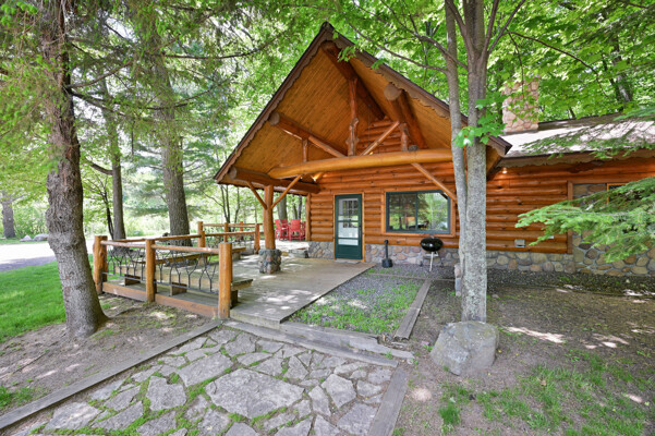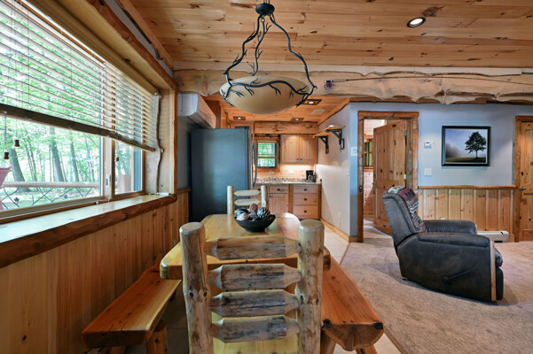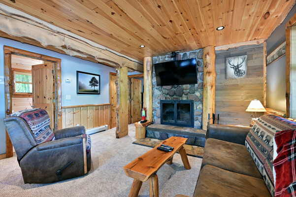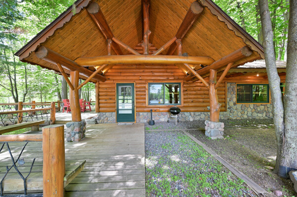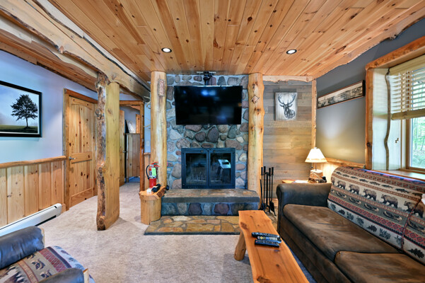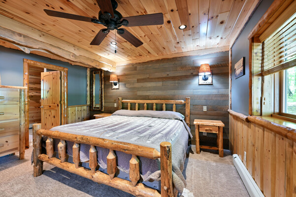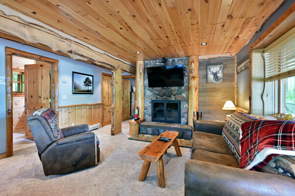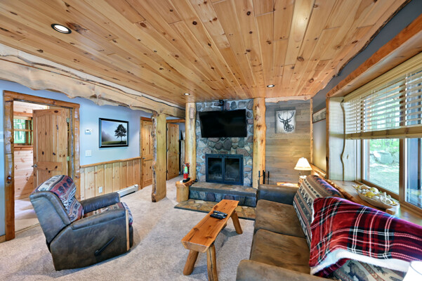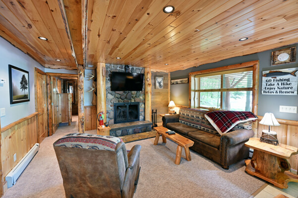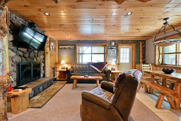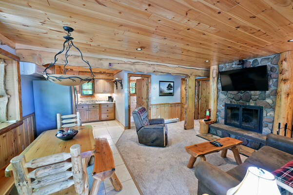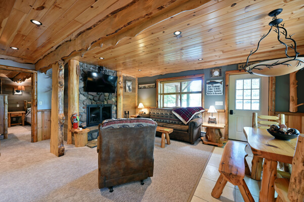 The single level cabin features a beautiful Northwoods rustic decor, spacious bedroom suite, full gourmet kitchen, 2 full baths and custom-built stone, wood burning fireplace.