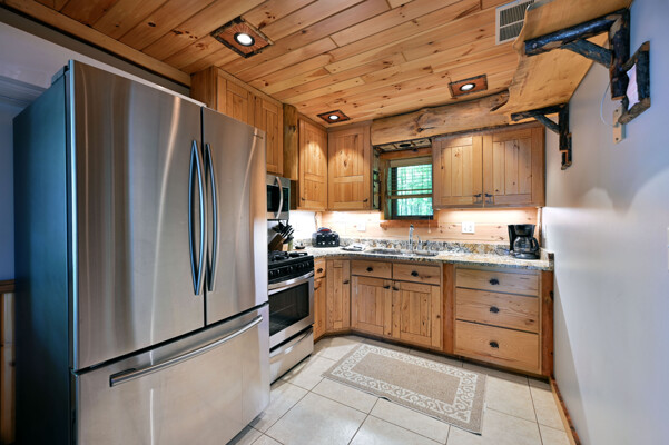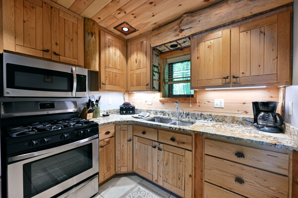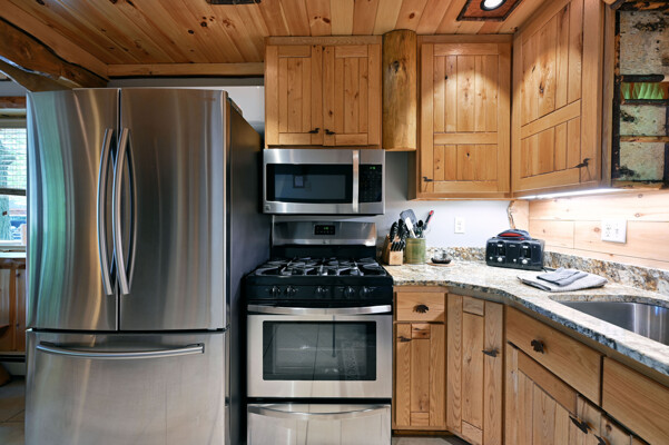The open interior with wood ceiling and beams includes a fully featured kitchen with new stainless steel appliances and granite countertops. There is a stylish, high capacity French door refrigerator with bottom freezer, 6 burner gas stove, microwave, toaster and microwave.