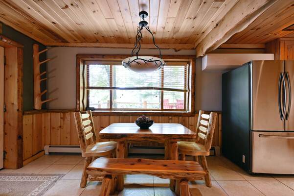 The warm, cozy retreat has eclectic and artistic wild wood finishing touches including cooper and birch bark light fixtures and window frames, custom accents made from local timber and hand hewn wood trim.