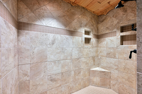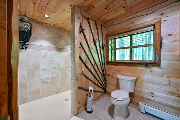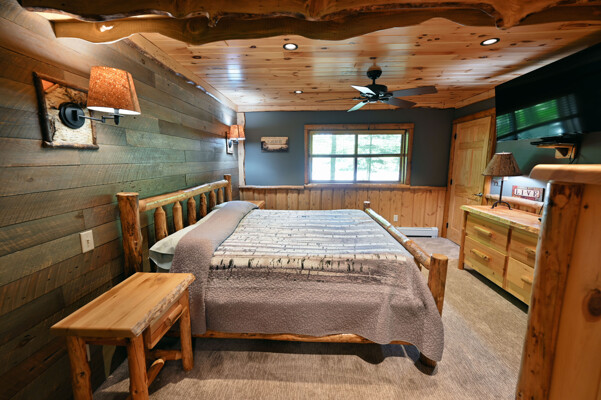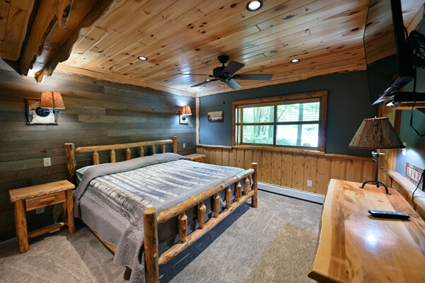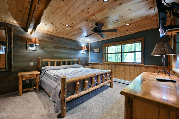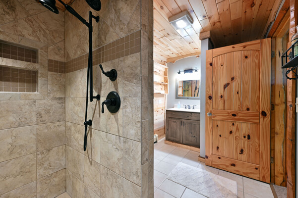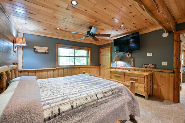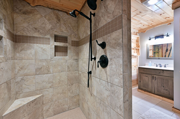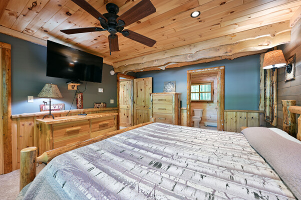 The spacious master bedroom suite features a log frame king size bed with individual, bedside lighting controls, wall mounted flat screen TV, ceiling fan and large master bath with a custom designed walk-in shower with level threshold, wall-mounted and handheld showerheads, a shower seat and a wall niche for shower supplies.