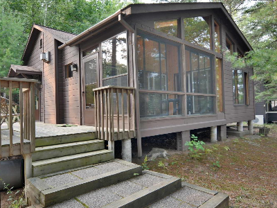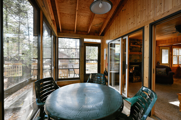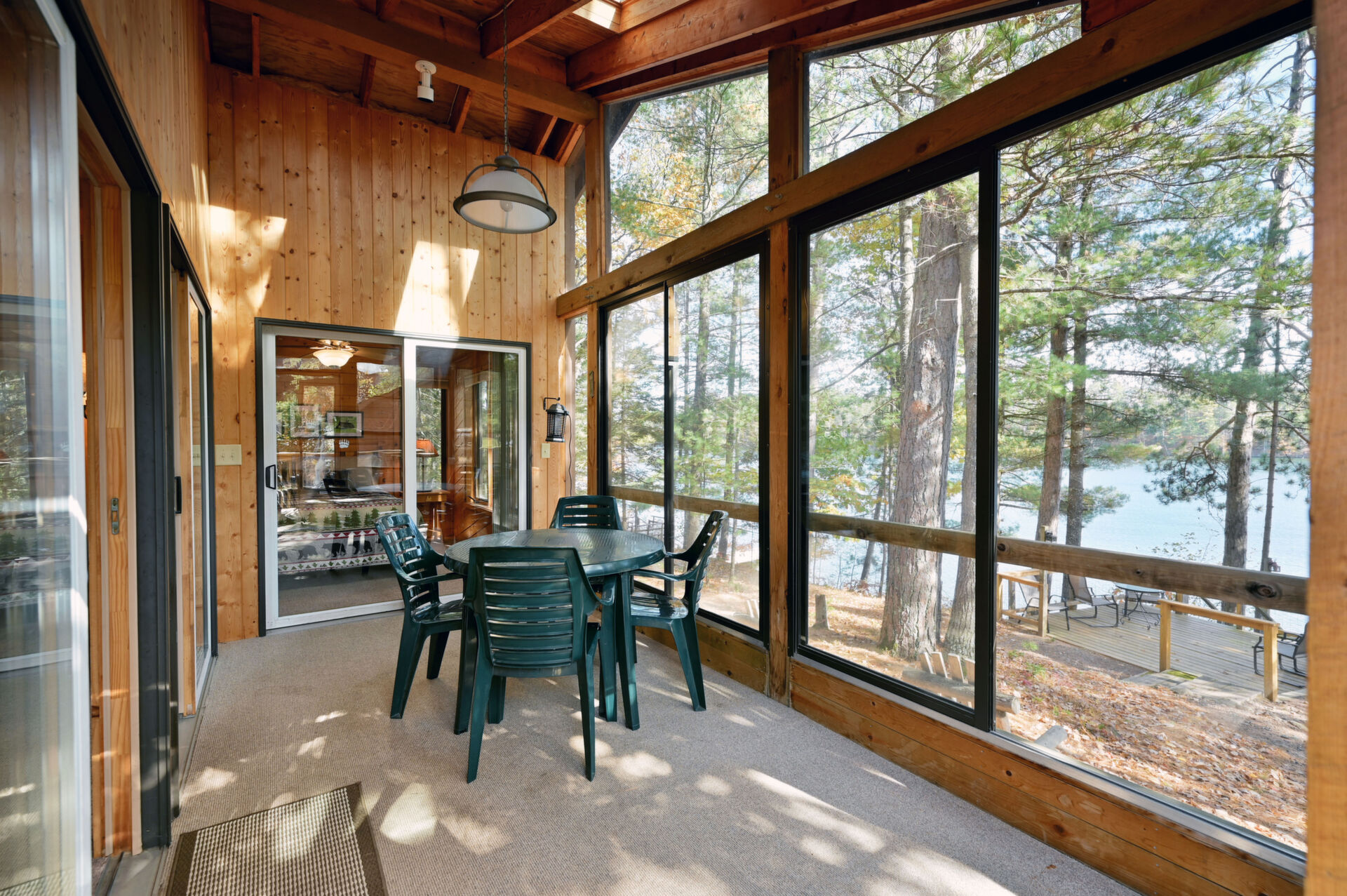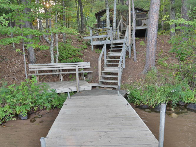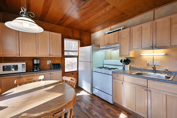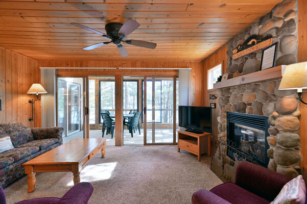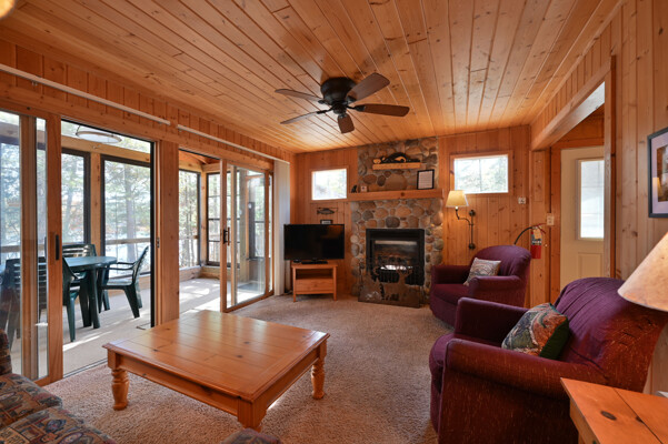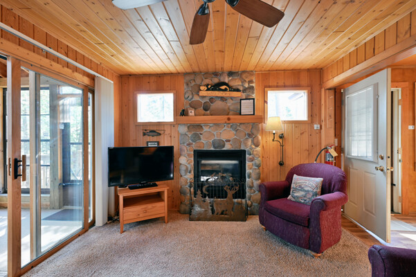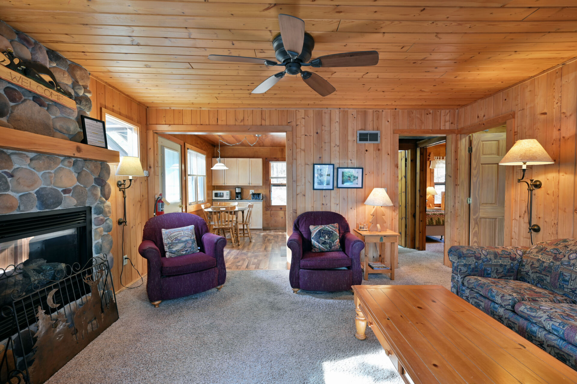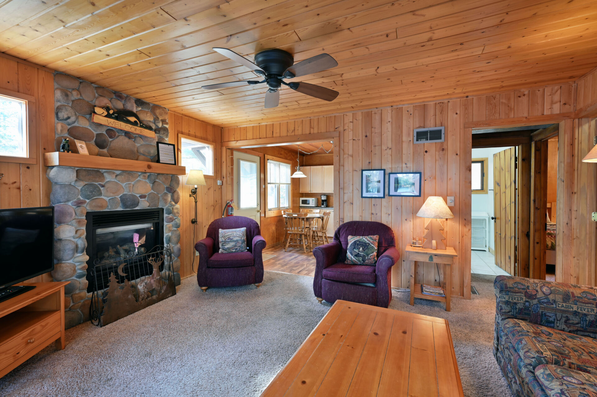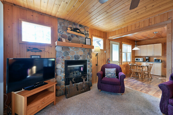 Living room with rocked gas fireplace, pull out couch, knotty pine paneling, kitchen with dining area, full stove/oven, full refrigerator, freezer, microwave, toaster, coffee pot, basic cooking utensils, dining dishes, glassware, cups, & silverware. Master bedroom with shower, 2nd bath with shower, flat screen cable TV, wi-fi, swim area with raft, private dock, deck, fire pit, BBQ and screened porch.