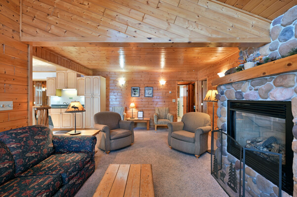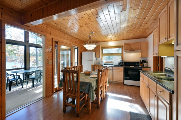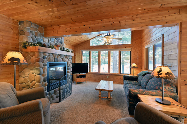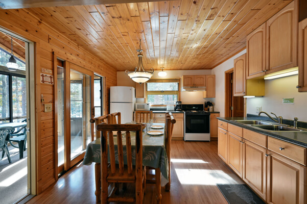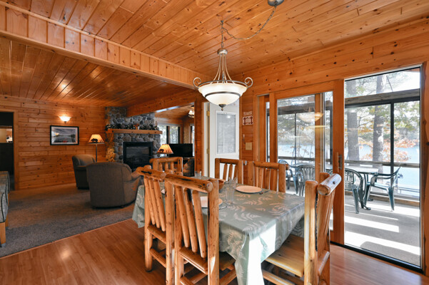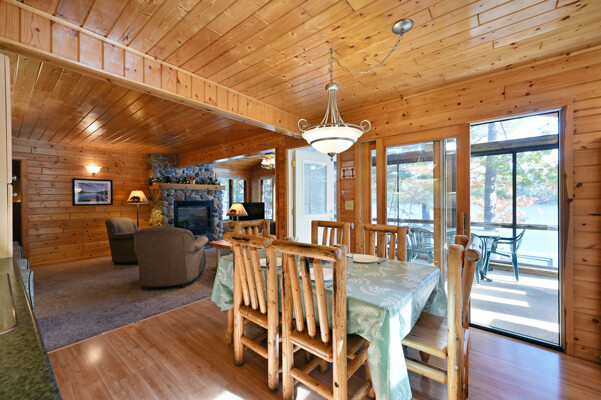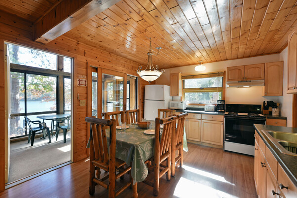 Living room with rocked gas fireplace, pull out couch, knotty pine paneling, kitchen with dining area, full stove/oven, full refrigerator,freezer, microwave, toaster, coffee pot, basic cooking utensils, dining dishes, glassware, cups, & silverware. Master bedroom with shower, 2nd bath with shower, flat screen cable TV, wi-fi, swim area with raft, private dock, deck, fire pit, BBQ and screened porch.