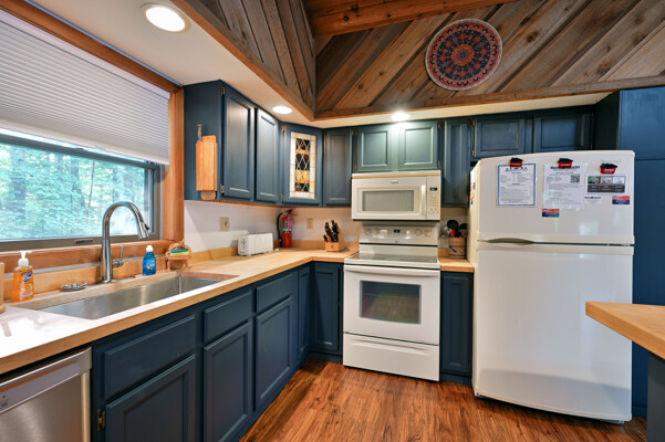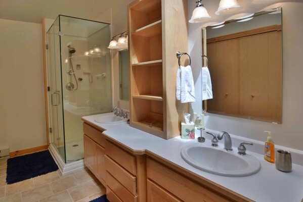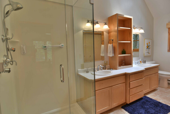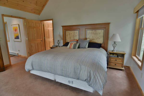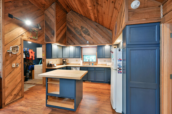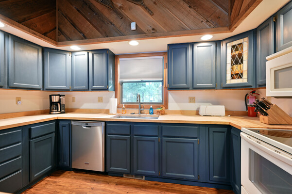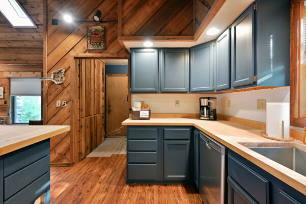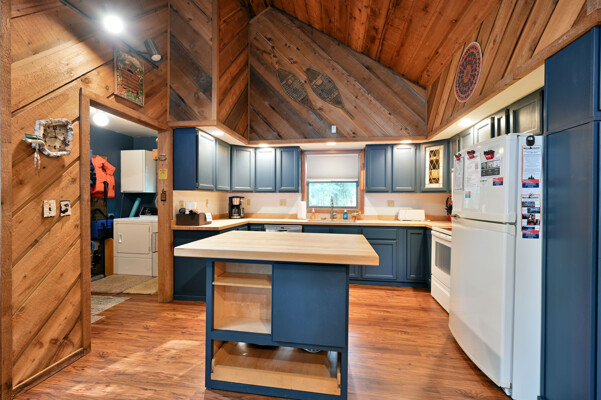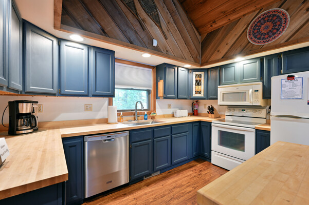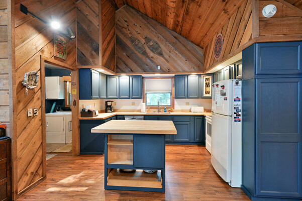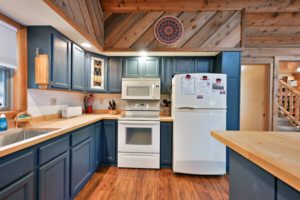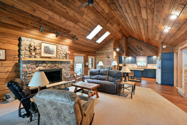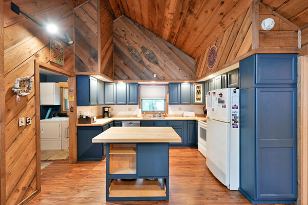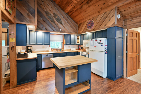 This spacious quality vacation home offers 3 bedrooms and a loft with a futon sofa. There are two full baths including a spacious master suite. The great room with vaulted ceilings has a lakeside sitting area a beautiful wood-burning stone fireplace and a small library/den area. A short flight of stairs leads you to the loft area with a sofa futon and flat-screen TV which makes this a great space to hang out. Down a hallway off the great room are the 3 bedrooms and 2 baths. Which includes the master bedroom suite with a king-size bed and ensuite bath, another bedroom with a king-size bed, and the third bedroom with 2 twin beds. You will have a fully equipped kitchen with a kitchen island.