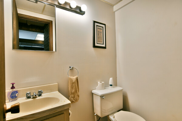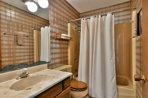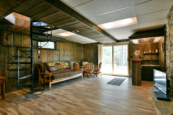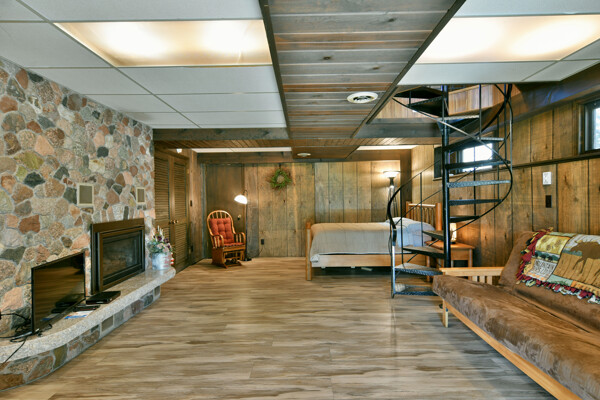 Connected by a metal spiral staircase, the walkout lower level has a stone fireplace (gas), 1 double bed, wet bar, washer/dryer and second full bath.