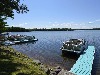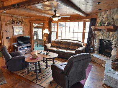 Pontoon included with this Round Lake cabin rental! Three-bedroom deluxe with two queen beds, 2 bunk beds and sofa sleeper, off water on Big Round, single story, one bath, one half bath off the master bedroom, one fireplace.