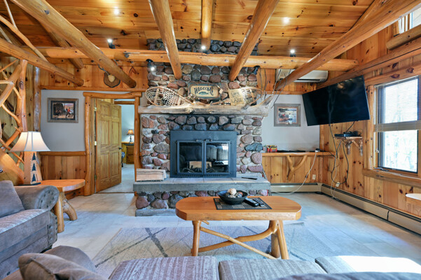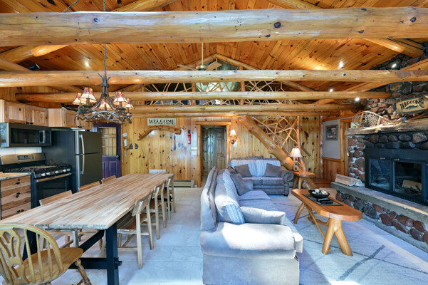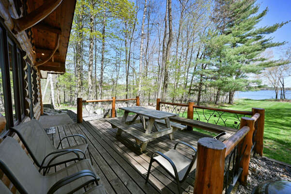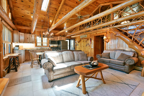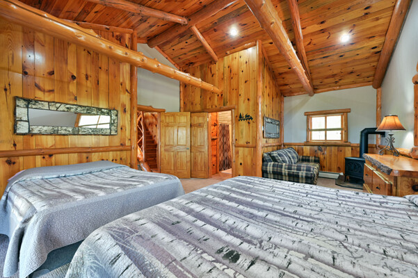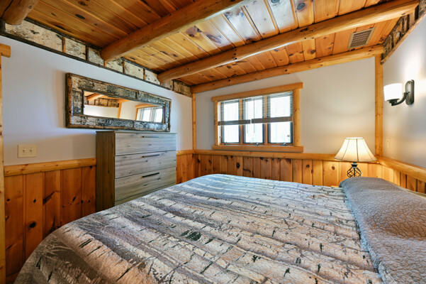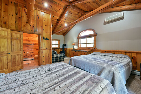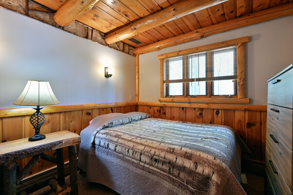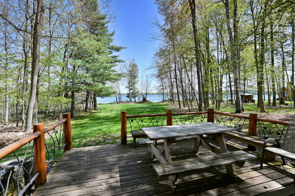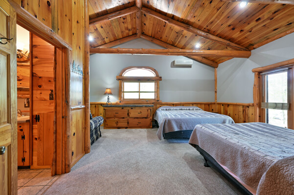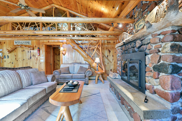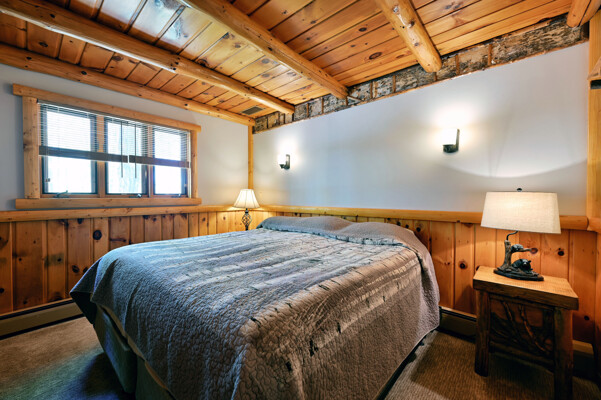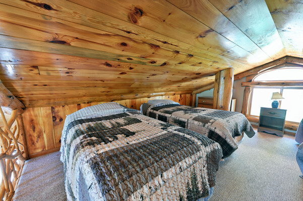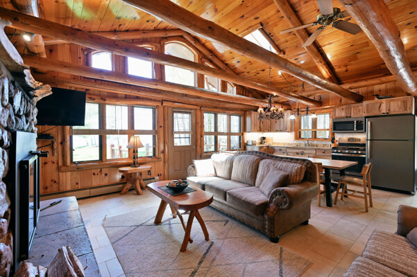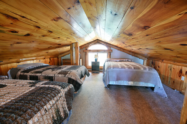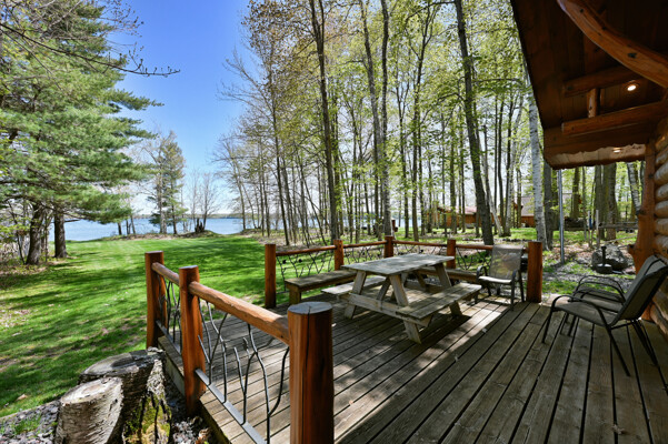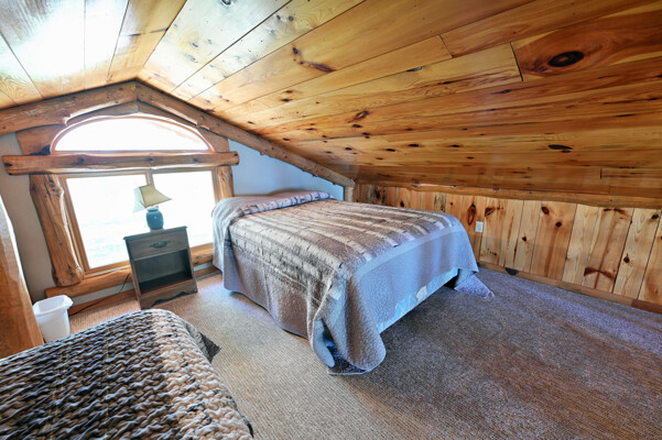 Lakeside Loft has 500 feet of lake frontage, a deck overlooking the lake and large yard, log exterior, knotty pine interior with unique log beams and accents. 1800 square feet of living space with 3 bedrooms + loft (9 beds), 2 full baths, phone, Cable TV and is handicap accessible.