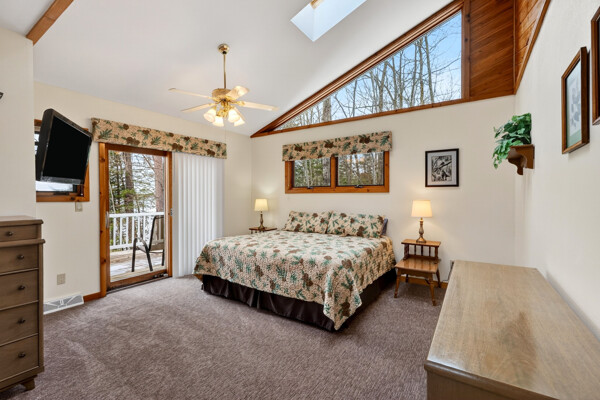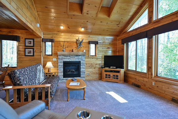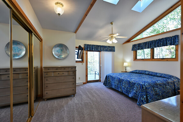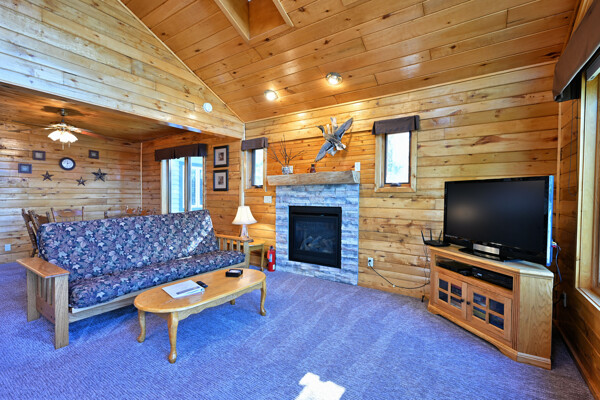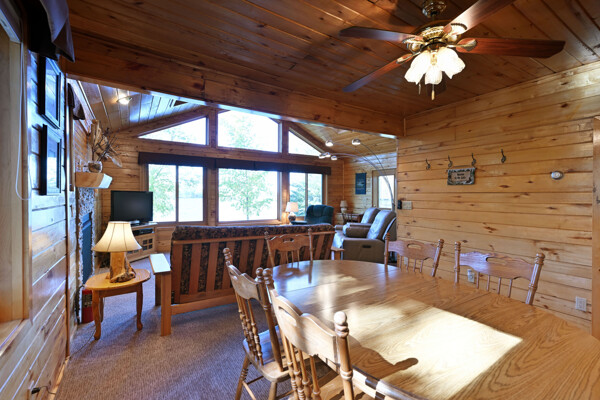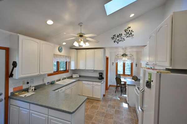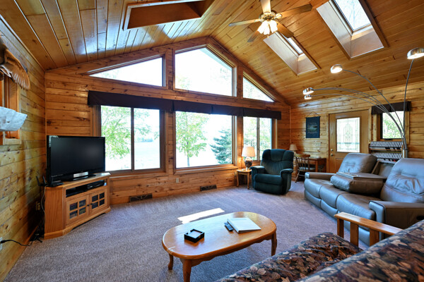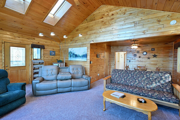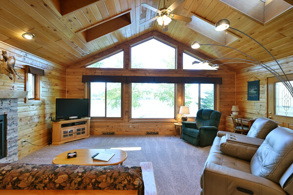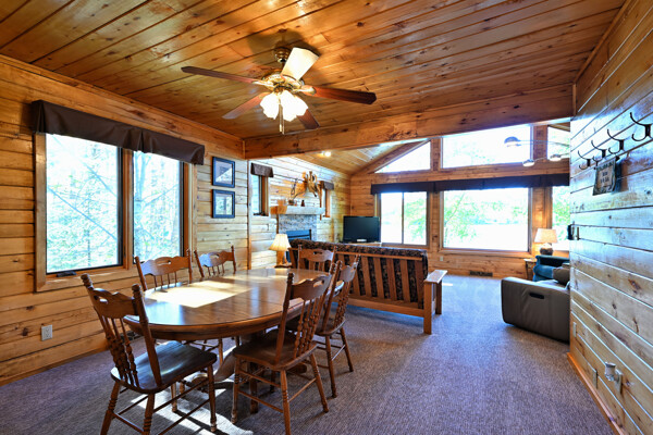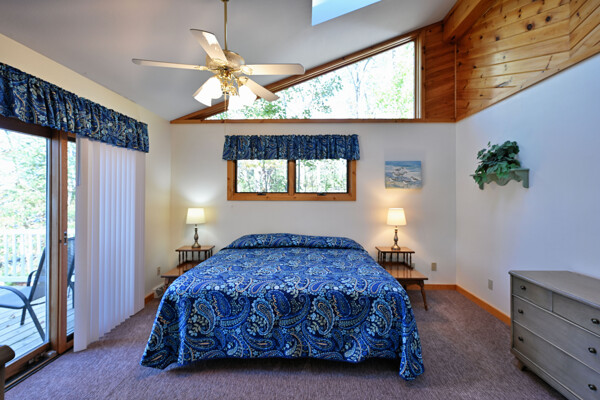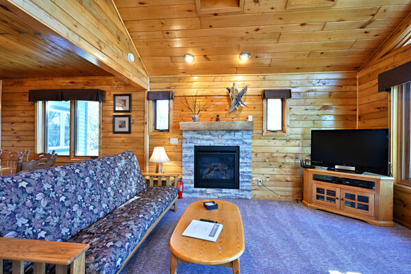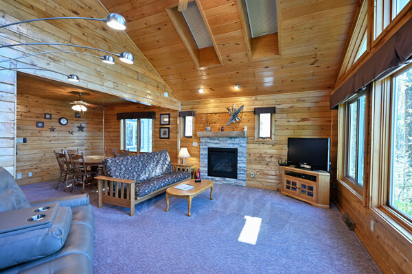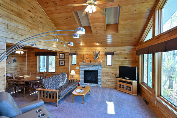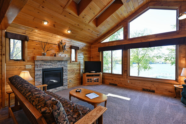 The 2 bedroom lake home rental features a spacious living room with skylights and spectacular views of the lake. Relax, kick back and get warm around the wood burning fireplace or watch your favorite DVD on the flat panel TV. With WiFi Internet and central air you are sure to be comfortably connected and happy during your vacation.