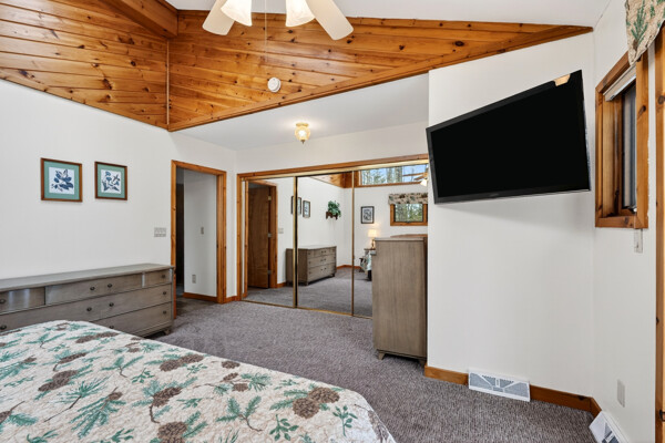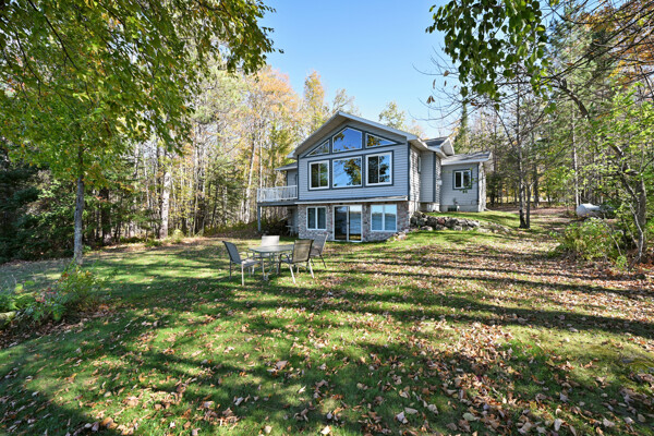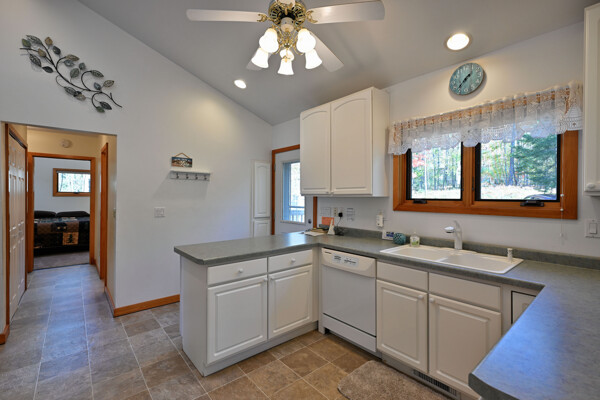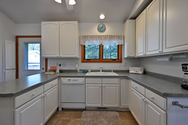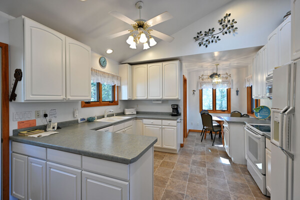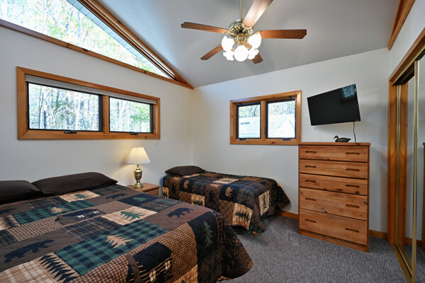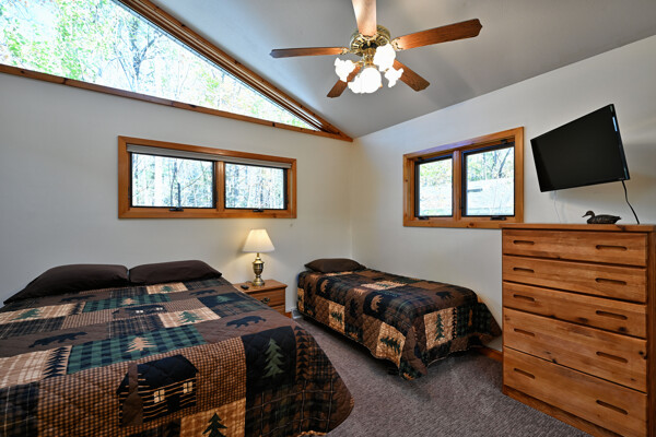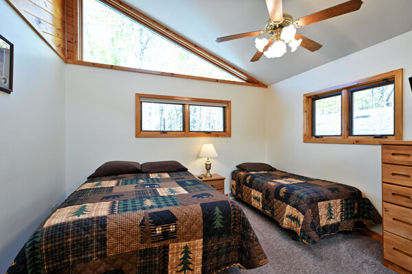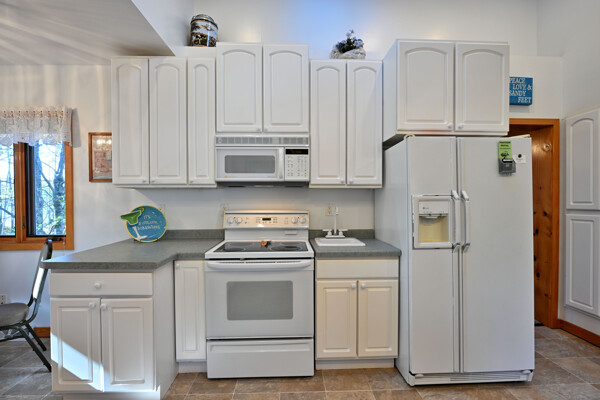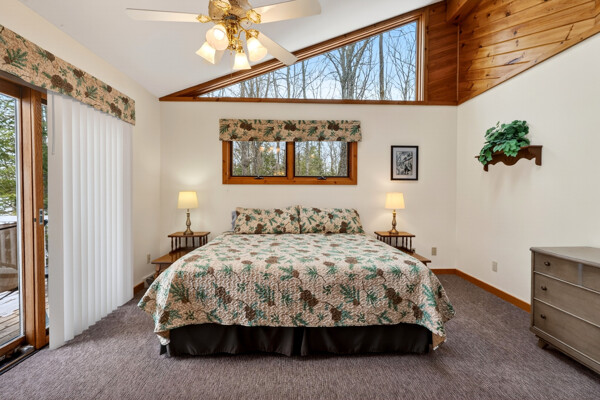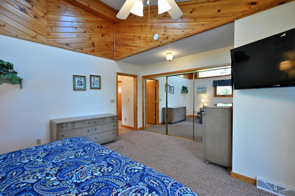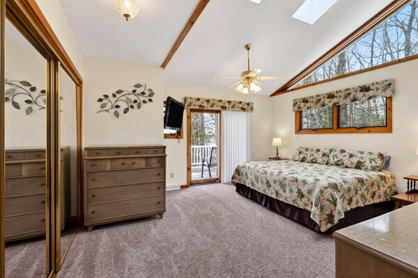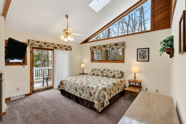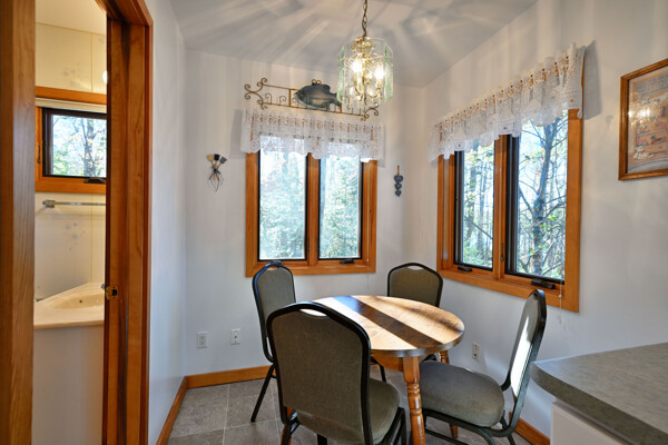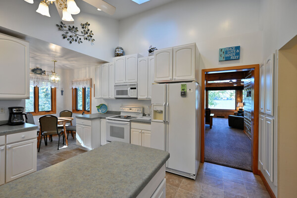 The 2 bedroom lake home rental features a spacious living room with skylights and spectacular views of the lake. Relax, kick back and get warm around the wood burning fireplace or watch your favorite DVD on the flat panel TV. With WiFi Internet and central air you are sure to be comfortably connected and happy during your vacation.
