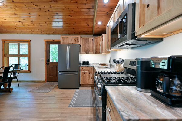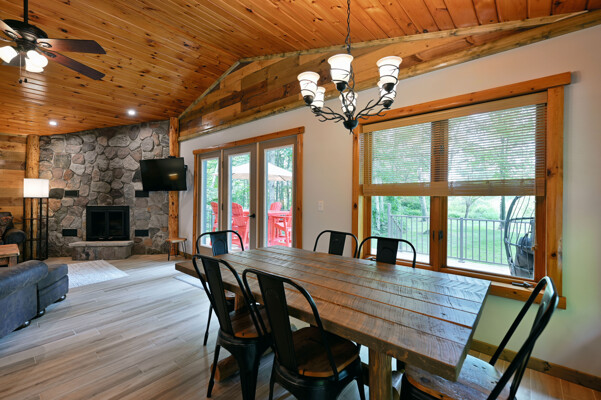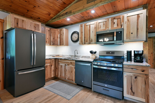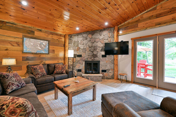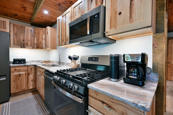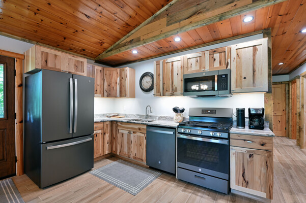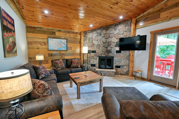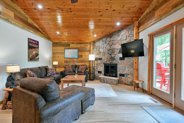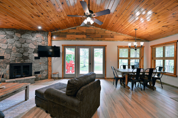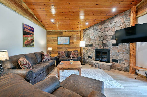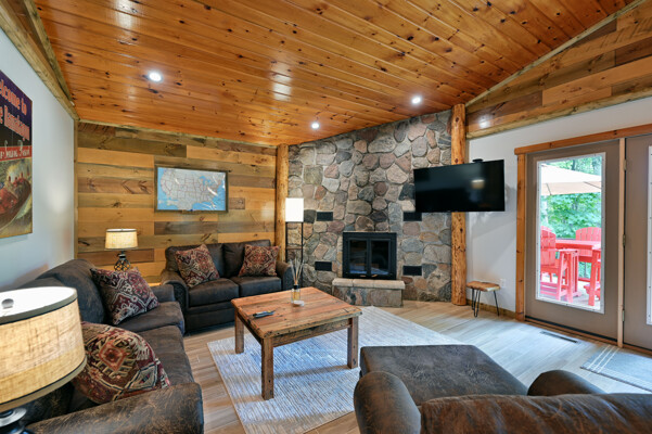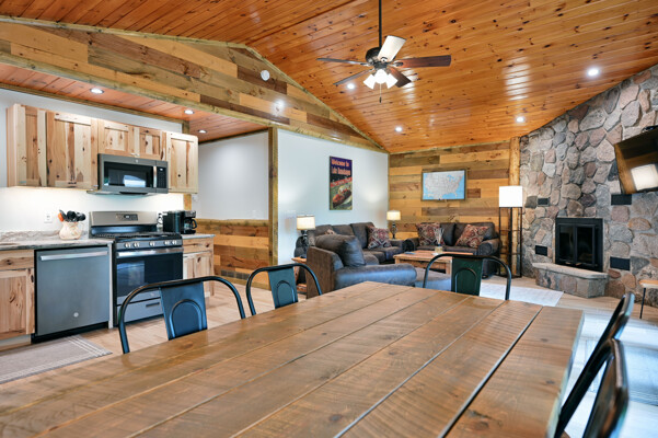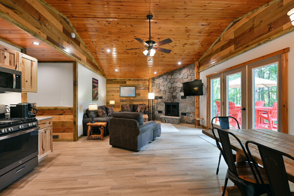 Step inside the cabin and relax. The open floor plan includes the living room centered around the split stone, wood-burning fireplace with comfy couch and chairs perfect for lounging. The 55” flat screen TV in the living room has Cable TV and streaming capabilities making an ideal setting for a movie night next to a crackling fire.