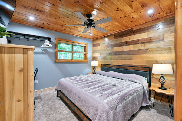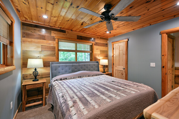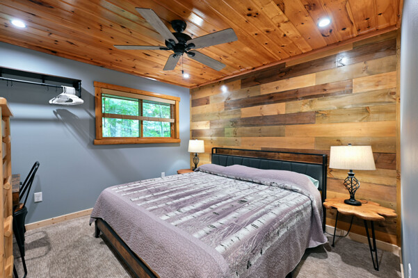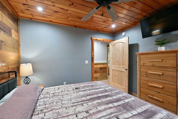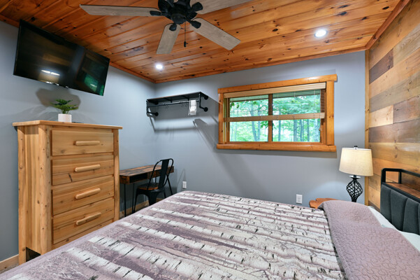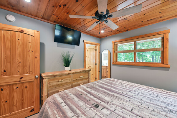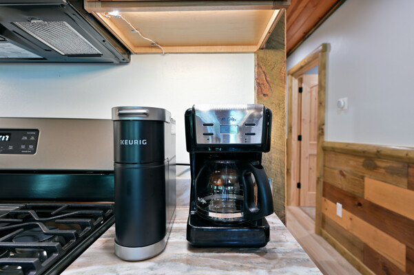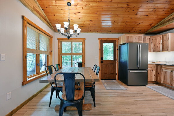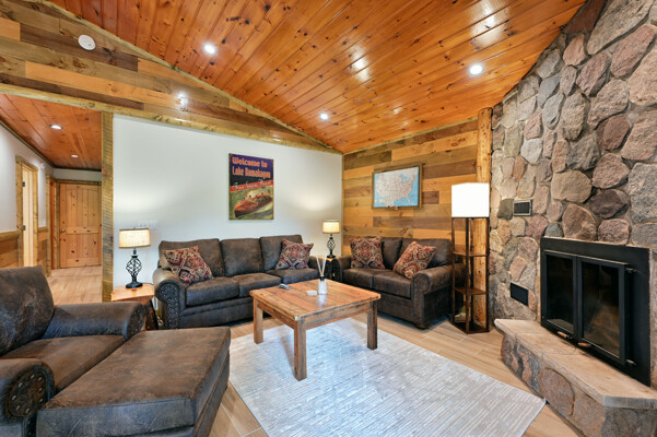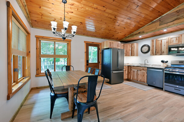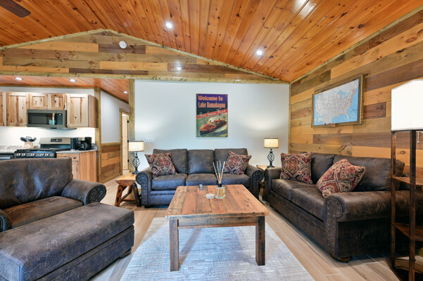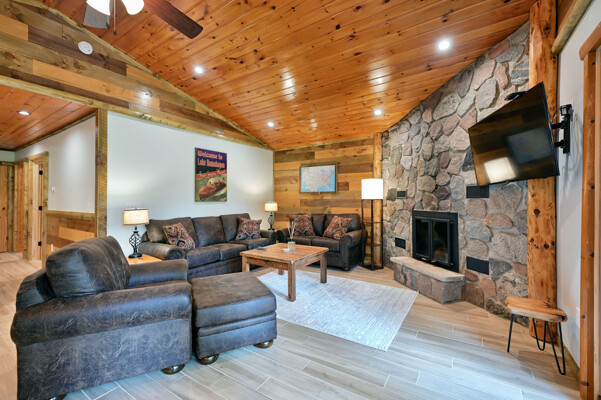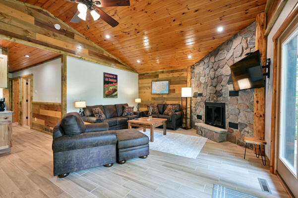 Step inside the cabin and relax. The open floor plan includes the living room centered around the split stone, wood-burning fireplace with comfy couch and chairs perfect for lounging. The 55” flat screen TV in the living room has Cable TV and streaming capabilities making an ideal setting for a movie night next to a crackling fire.