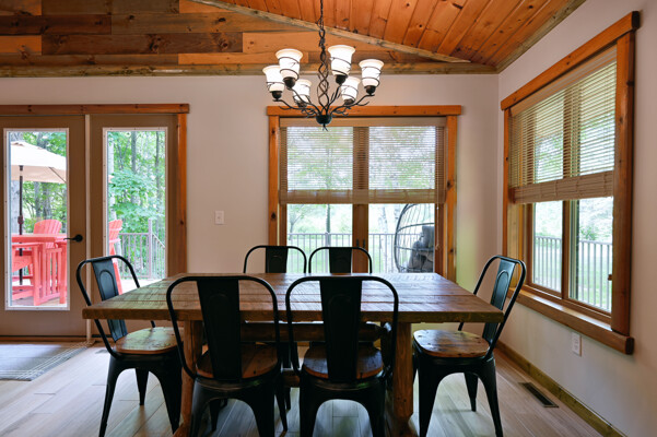 The fully furnished kitchen with rustic hickory cabinets includes a full-sized refrigerator, dishwasher, range/oven, microwave and both a drip and pod coffee maker. The dining room table and the patio table on the deck both comfortably seat 6 people.