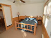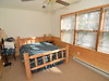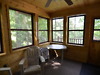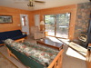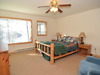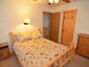 There is a carpeted bedroom off the living room with a log framed full bed. A second bedroom also has a full sized bed while the third bedroom enjoys a beautiful view of the lake with a queen sized bed and full bath. All three of the bedrooms have ceiling fans and there is a sofa sleeper futon in the living room.